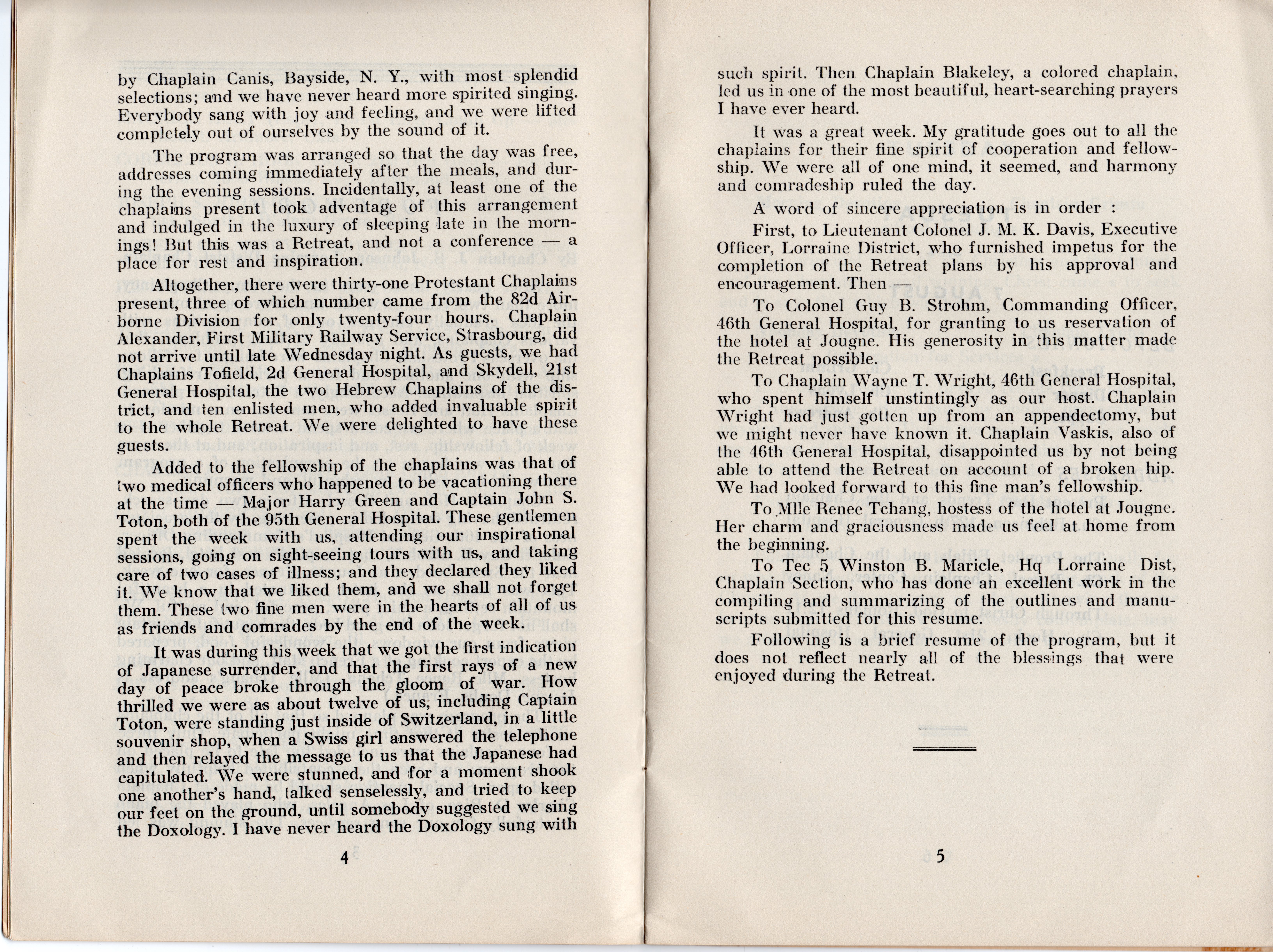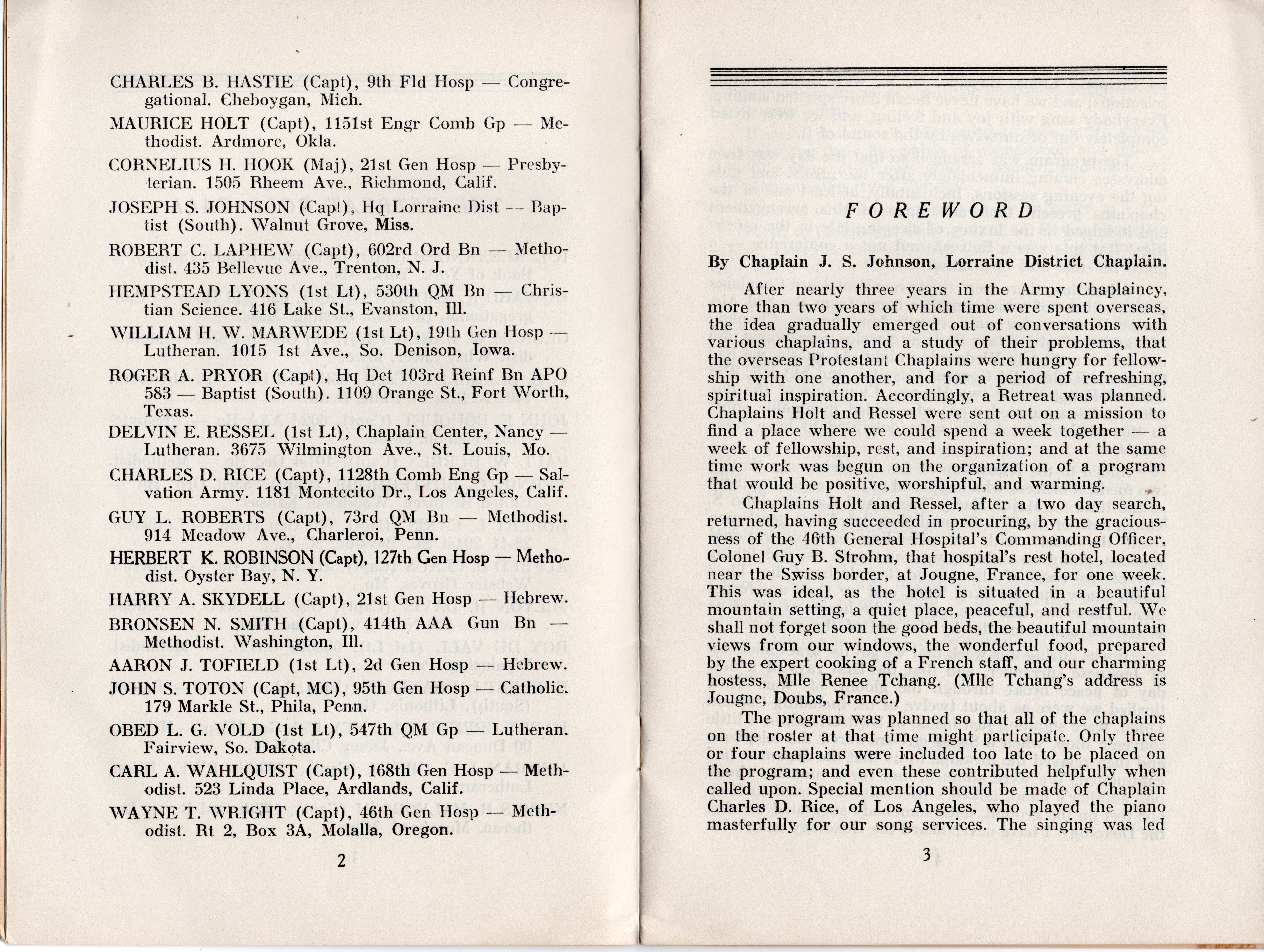 Following the end of the war in Europe, just as word was coming in about the Japanese surrender, Protestant Chaplains from the Lorraine District in France met for a time of fellowship, rest and relaxation, at the 46th General Hospital’s Retreat Center in Jougne, France on the Swiss border. Below is the booklet that was published following the retreat which has some of the remarks and devotionals given during the the chaplain’s time together.