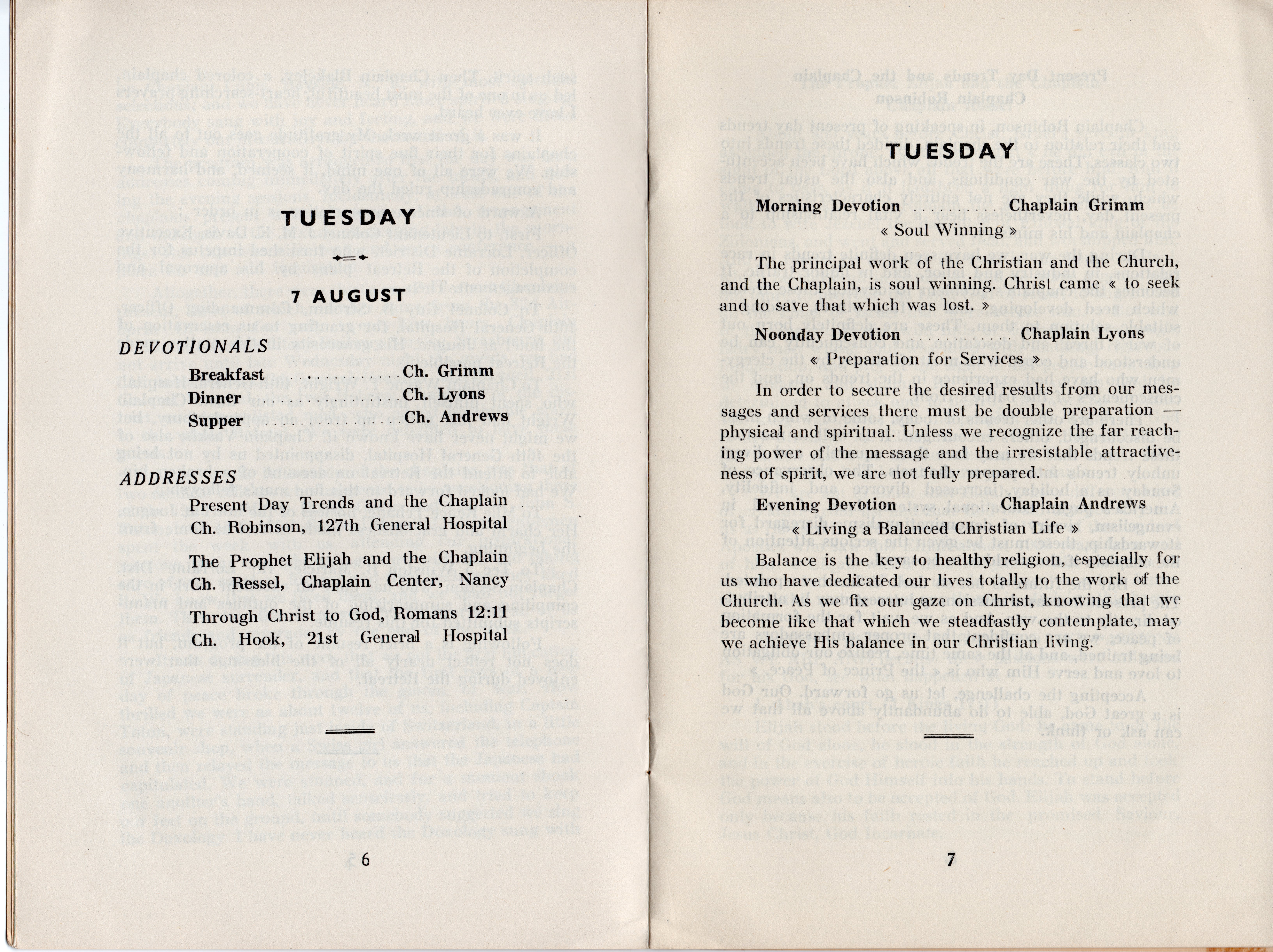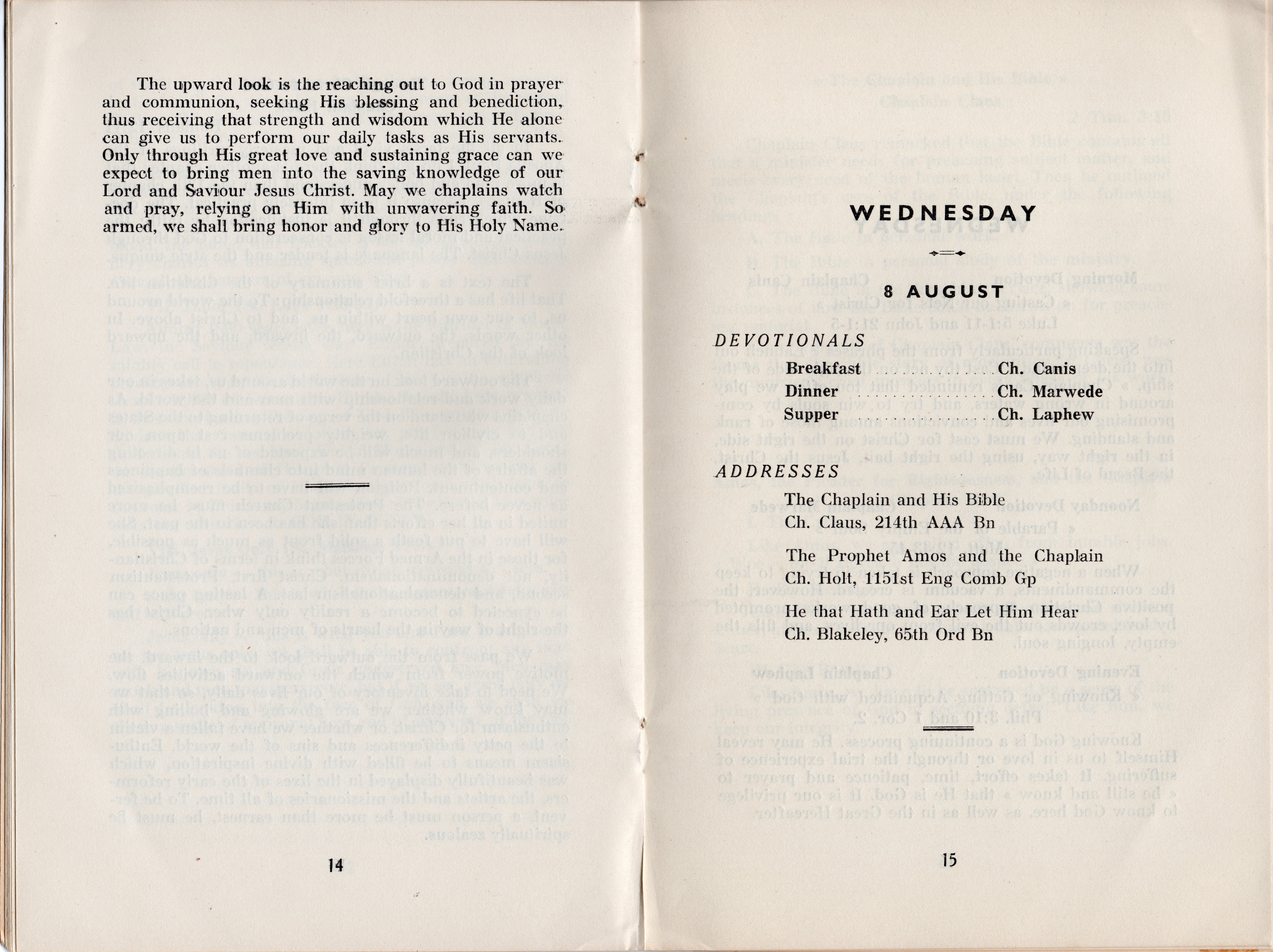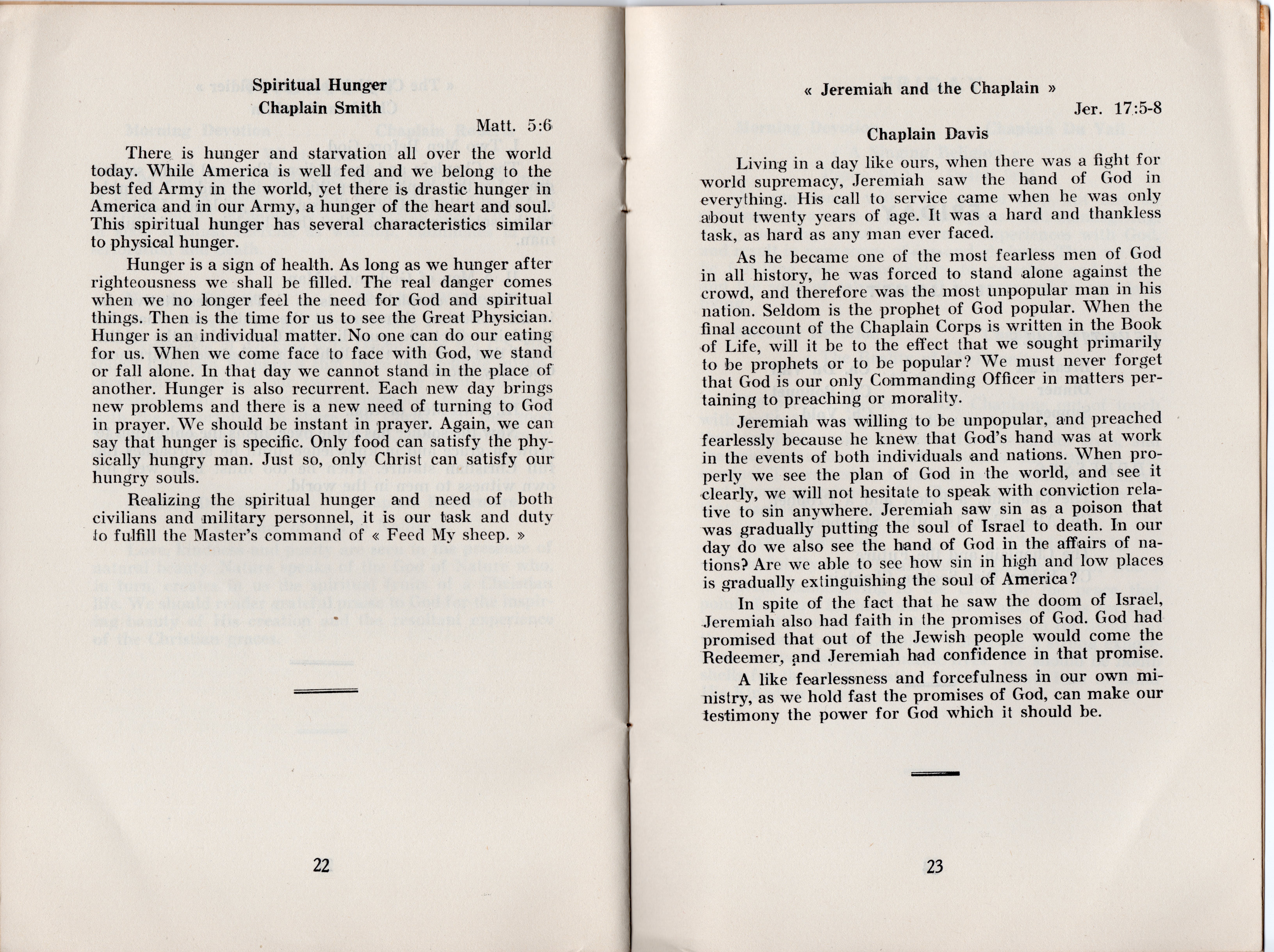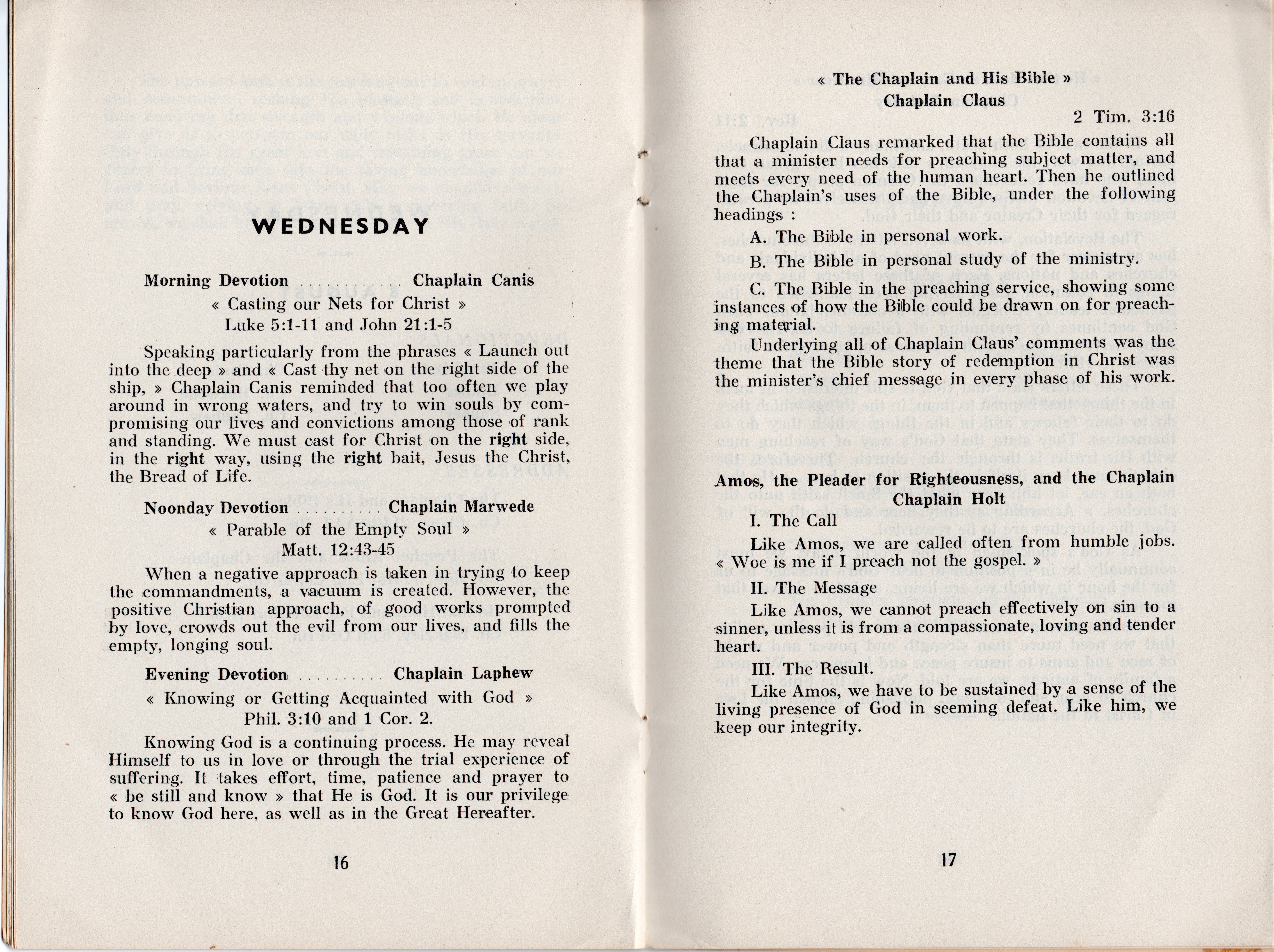 Some interesting titles of the addresses are: Present Day Trends and the Chaplain; The Prophet Elijah and the Chaplain; Through Christ to God, Romans 12:11; The Chaplain and His Bible; The Prophet Amos and the Chaplain; He that Hath an Ear Let Him Hear; The Chaplain and the Soldier; Spiritual Hunger-Matthew 5:6; The Prophet Jeremiah and the Chaplain; The Chaplain, a Priest and a Prophet; and The Chaplain and the Future. All of the address weren’t recorded in detail, but many of the highlights are included and most are very interesting, as are the included devotional thoughts.