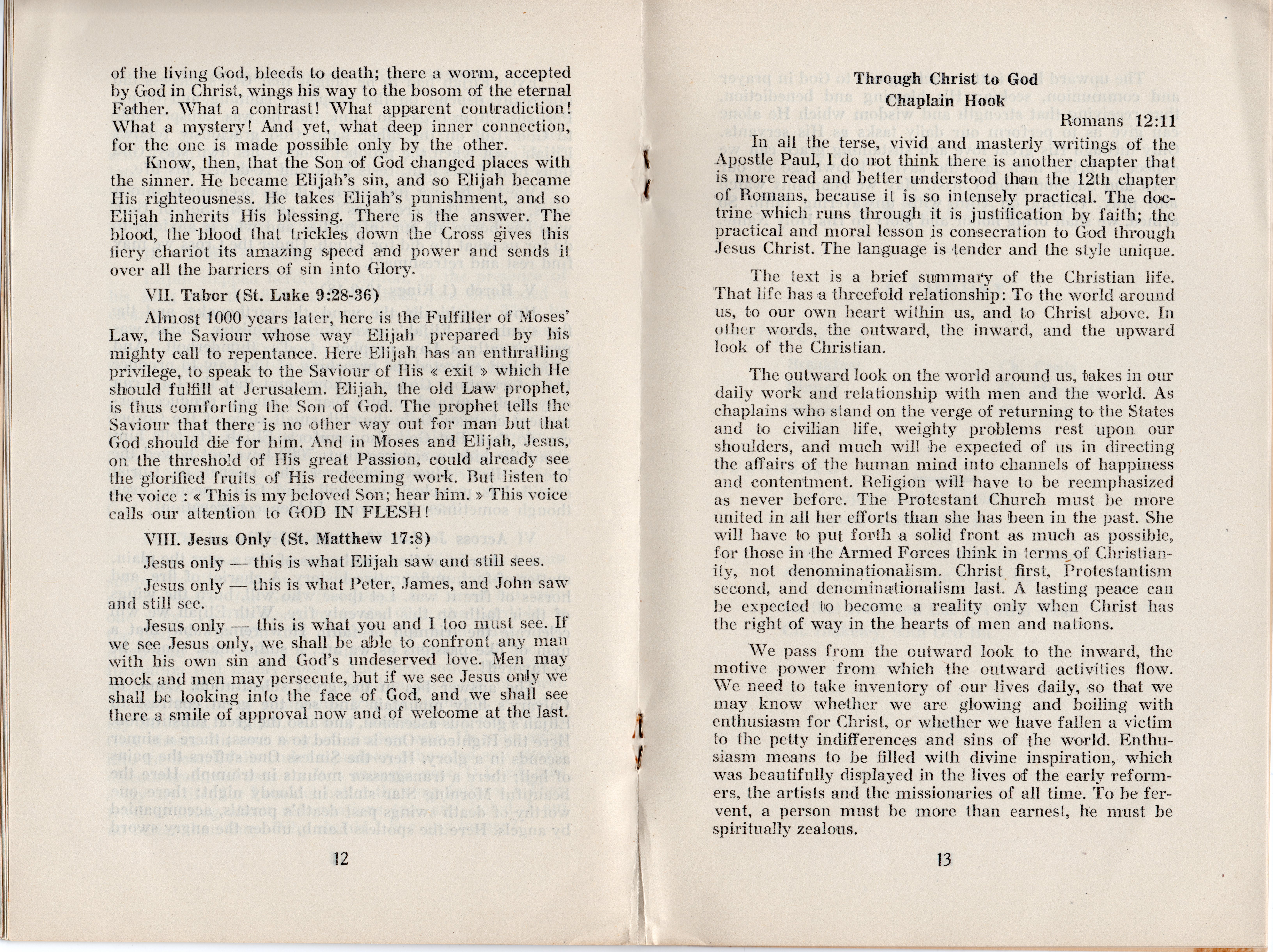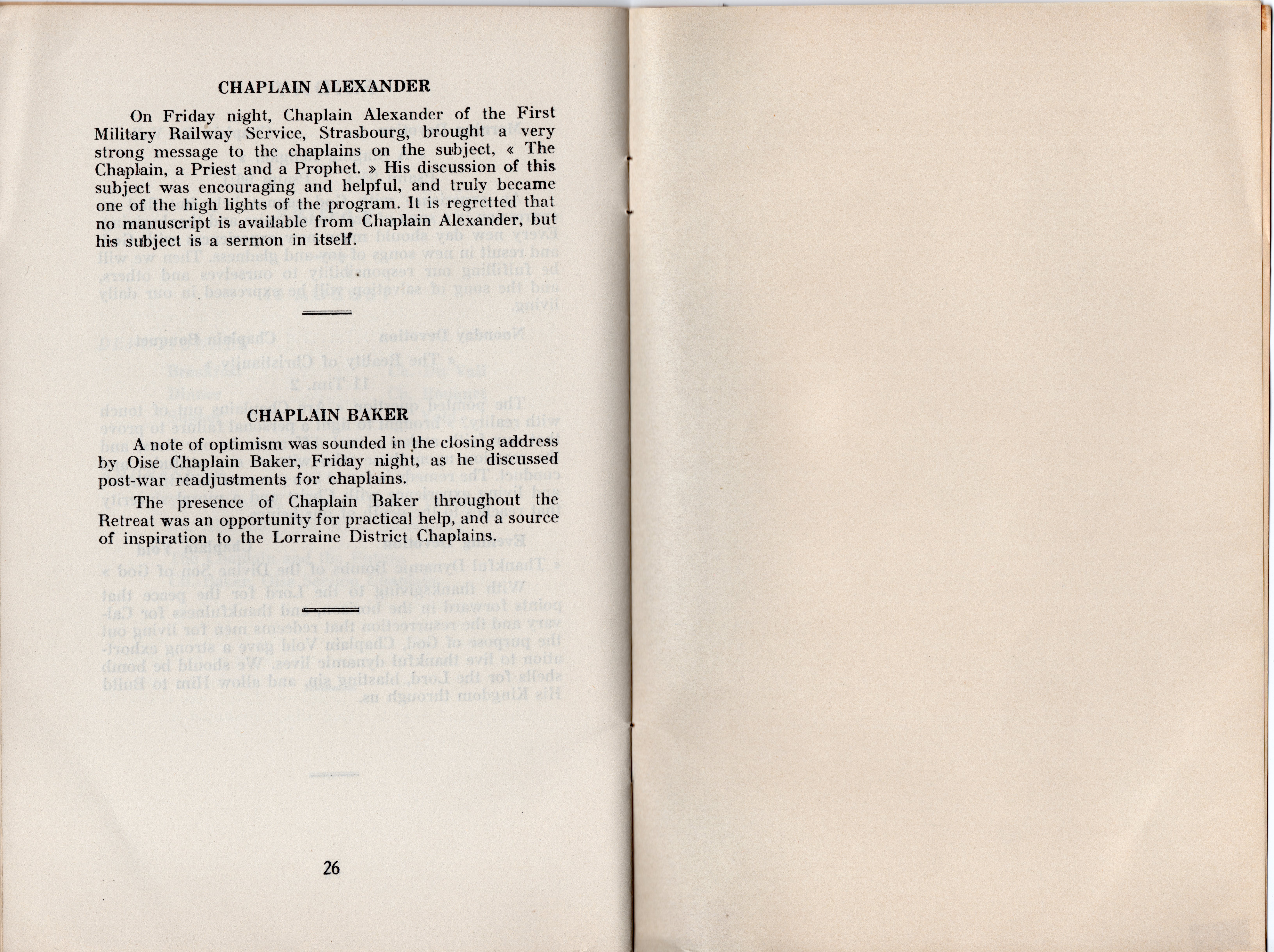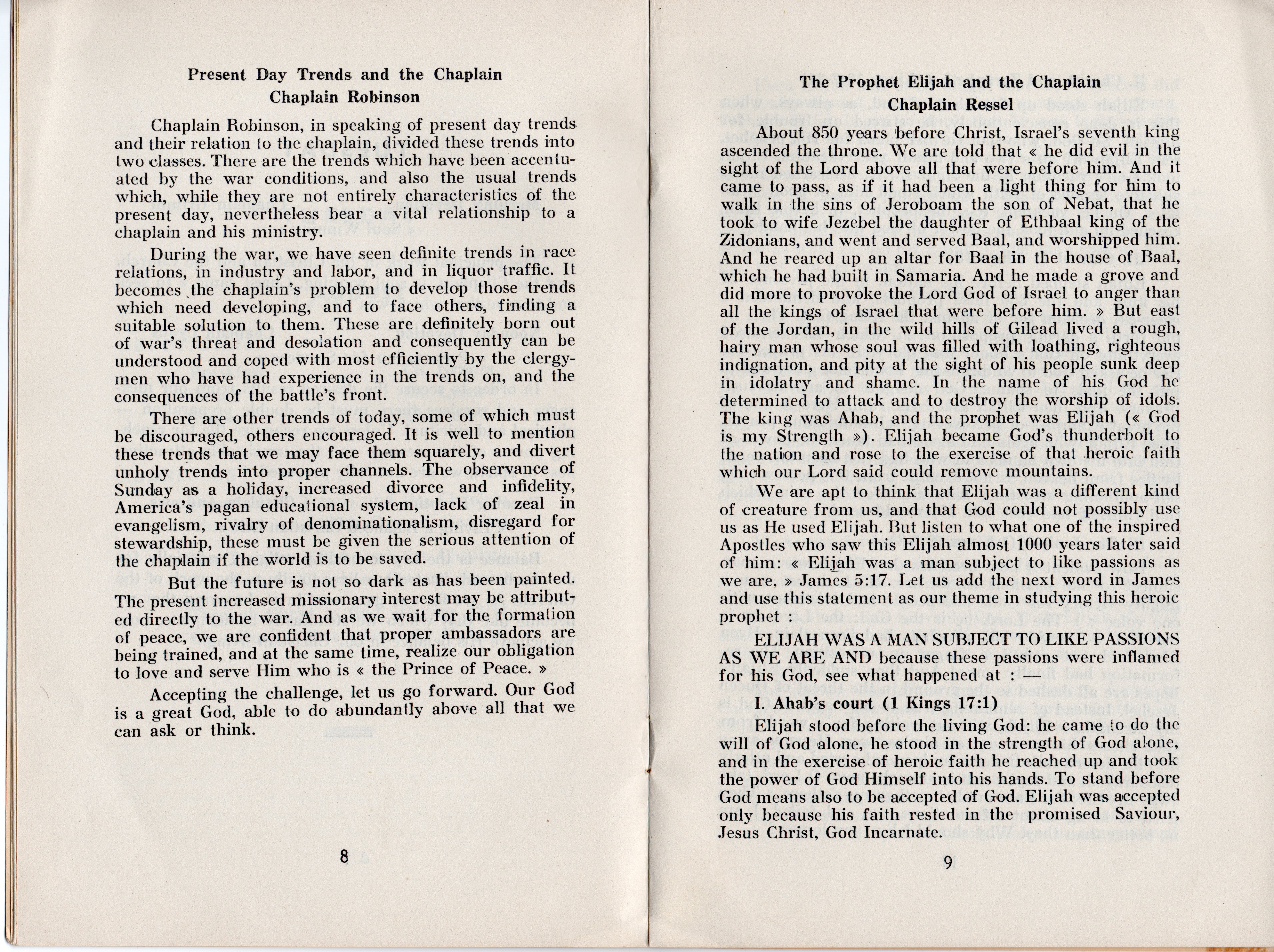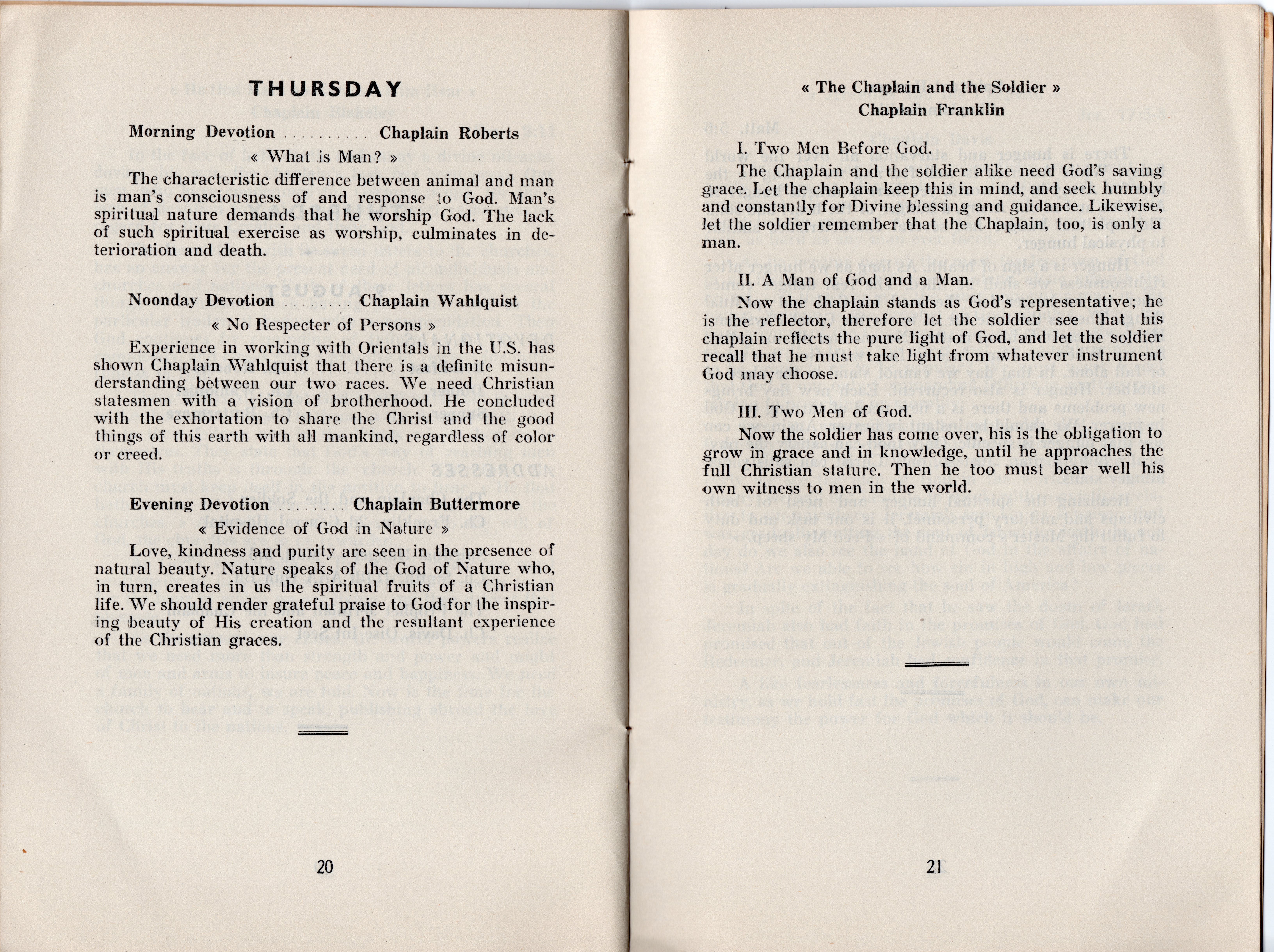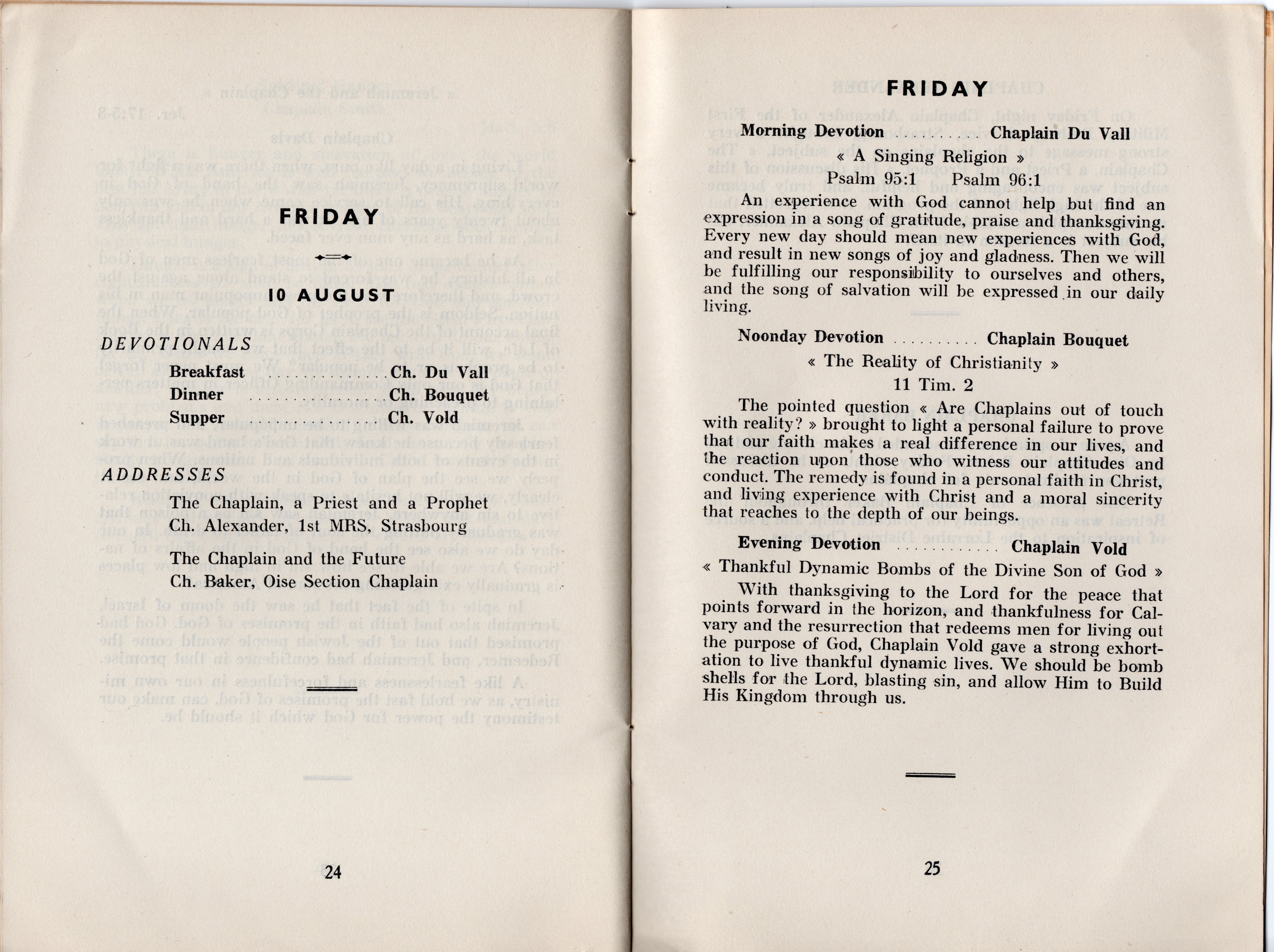 Some interesting titles of the addresses are: Present Day Trends and the Chaplain; The Prophet Elijah and the Chaplain; Through Christ to God, Romans 12:11; The Chaplain and His Bible; The Prophet Amos and the Chaplain; He that Hath an Ear Let Him Hear; The Chaplain and the Soldier; Spiritual Hunger-Matthew 5:6; The Prophet Jeremiah and the Chaplain; The Chaplain, a Priest and a Prophet; and The Chaplain and the Future. All of the address weren’t recorded in detail, but many of the highlights are included and most are very interesting, as are the included devotional thoughts.