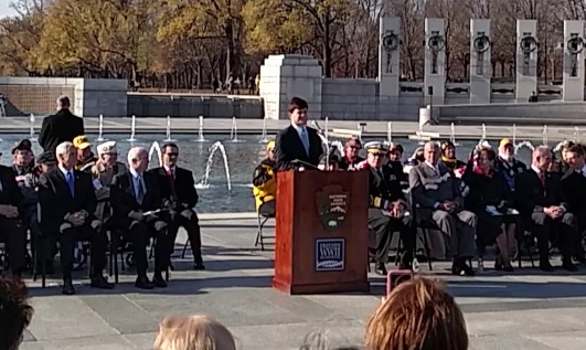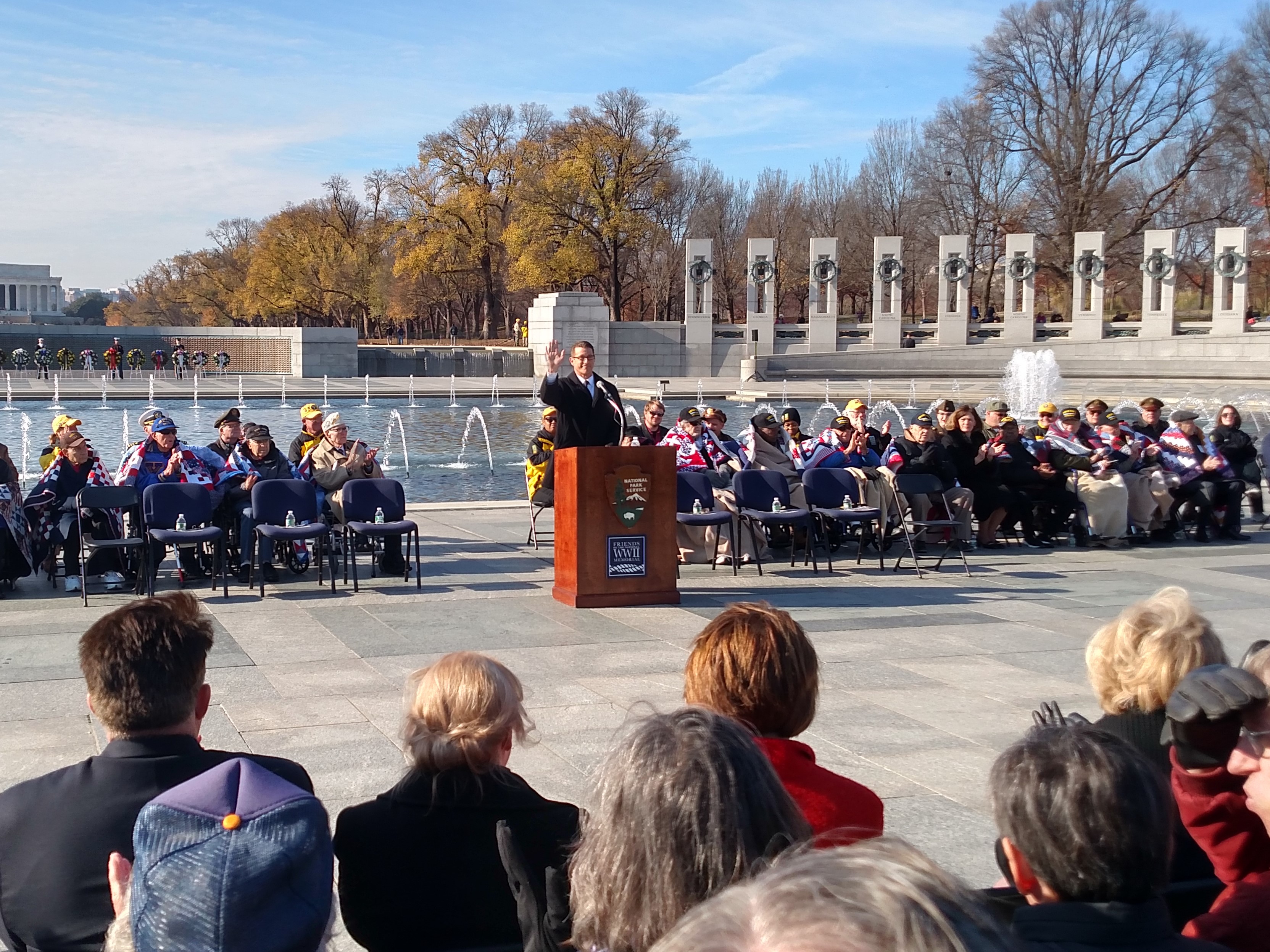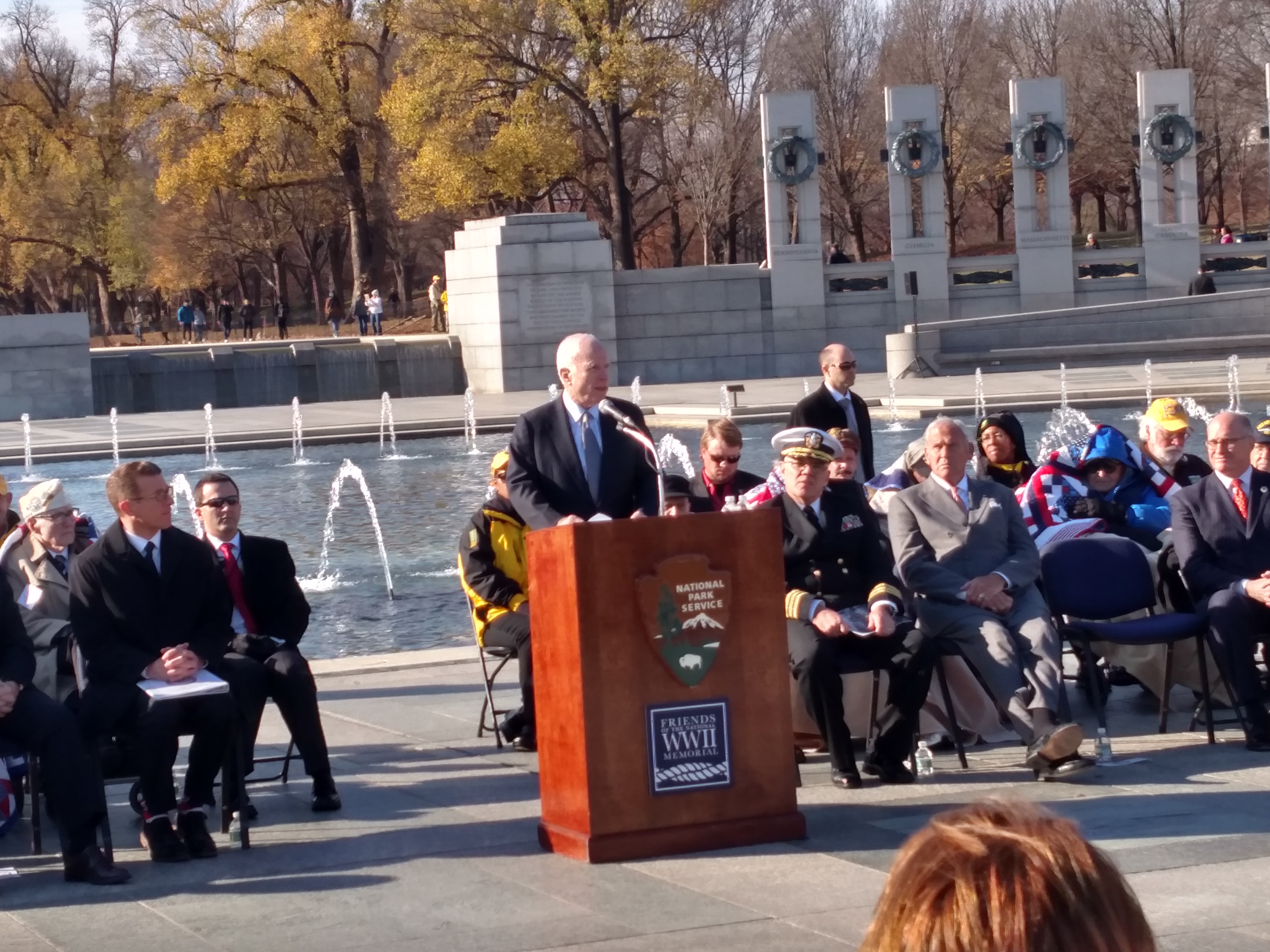 At the podium is Gay Vietzke, NPS Superintendent of the National Mall and Memorial Parks. Seated to the left is Senator McCain, Vice President-elect Mike Pence and Frederick Smith, founder and president of FedEx.