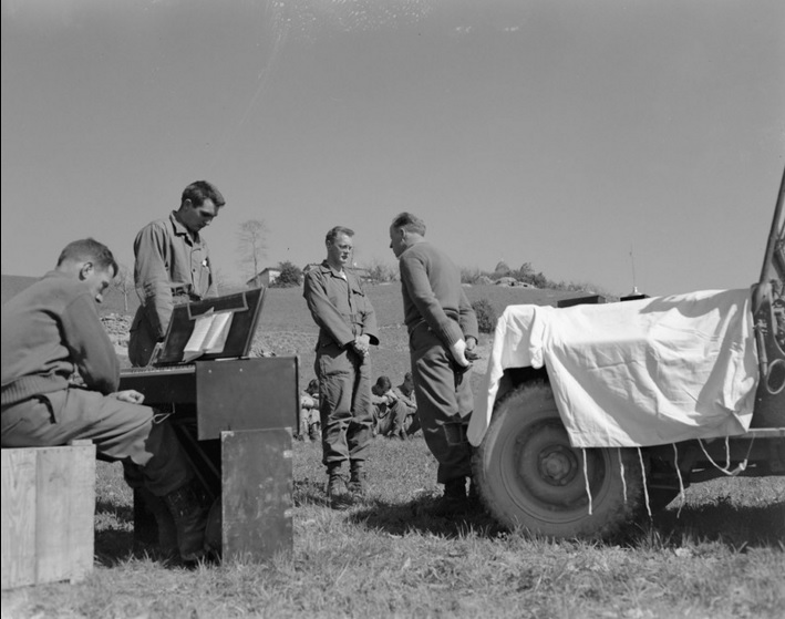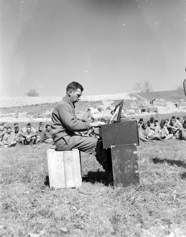 “Tenth Mountain Division Cpl. Ralph Squires plays the organ during the 605th Artillery Battalion Protestant Easter service held April 1, 1945, at Rocca Pitigliana, Italy. Worshipers sit on grass listening.”