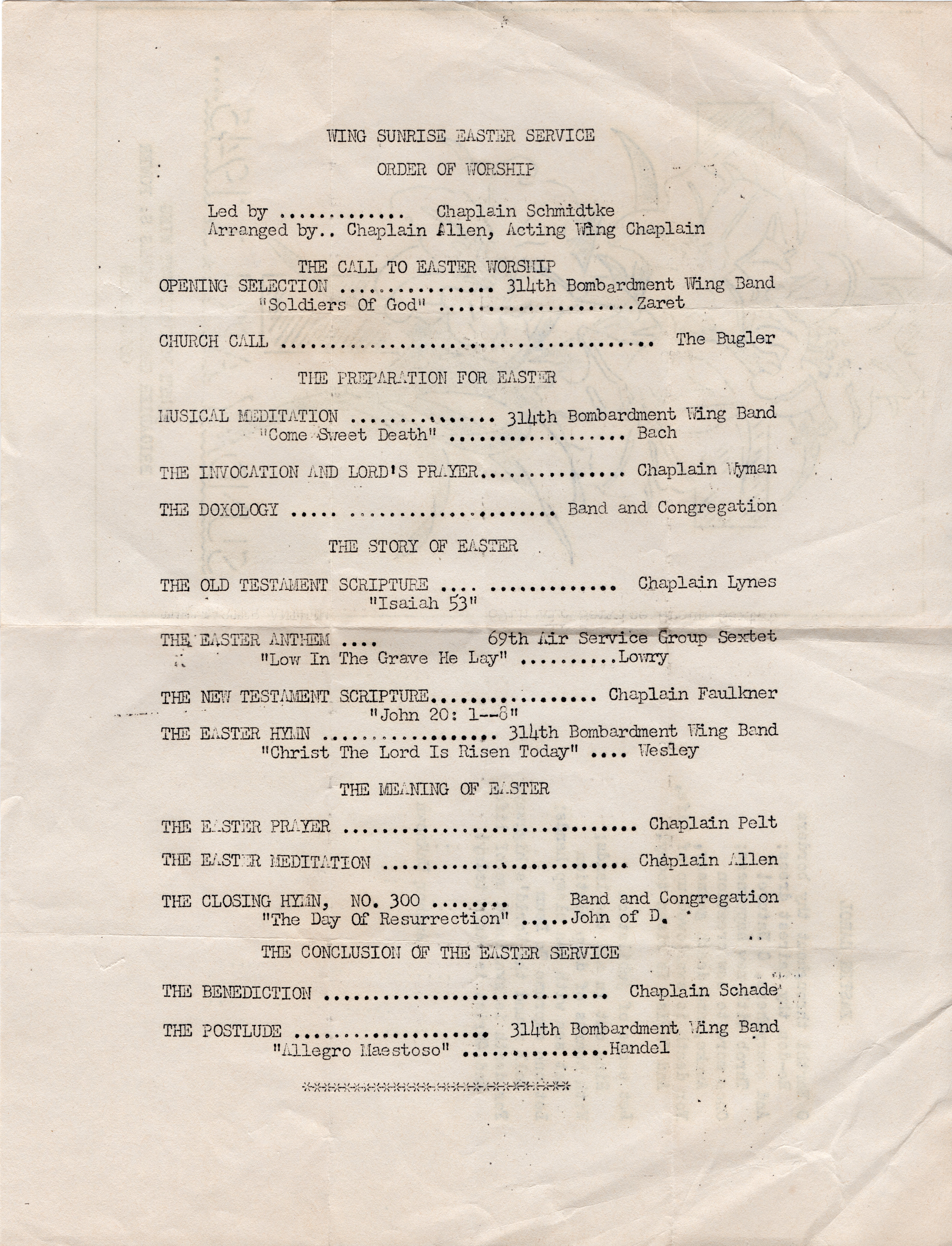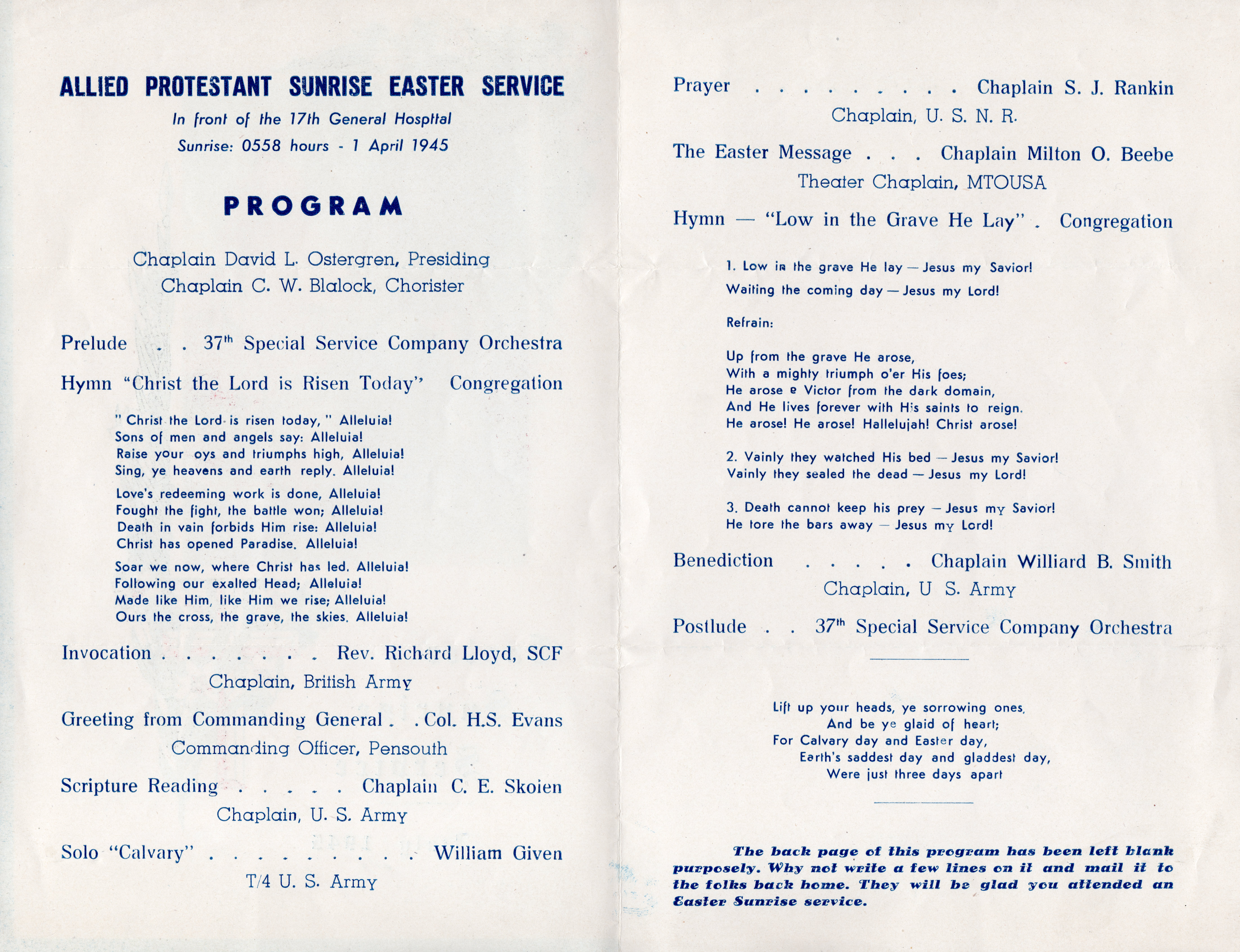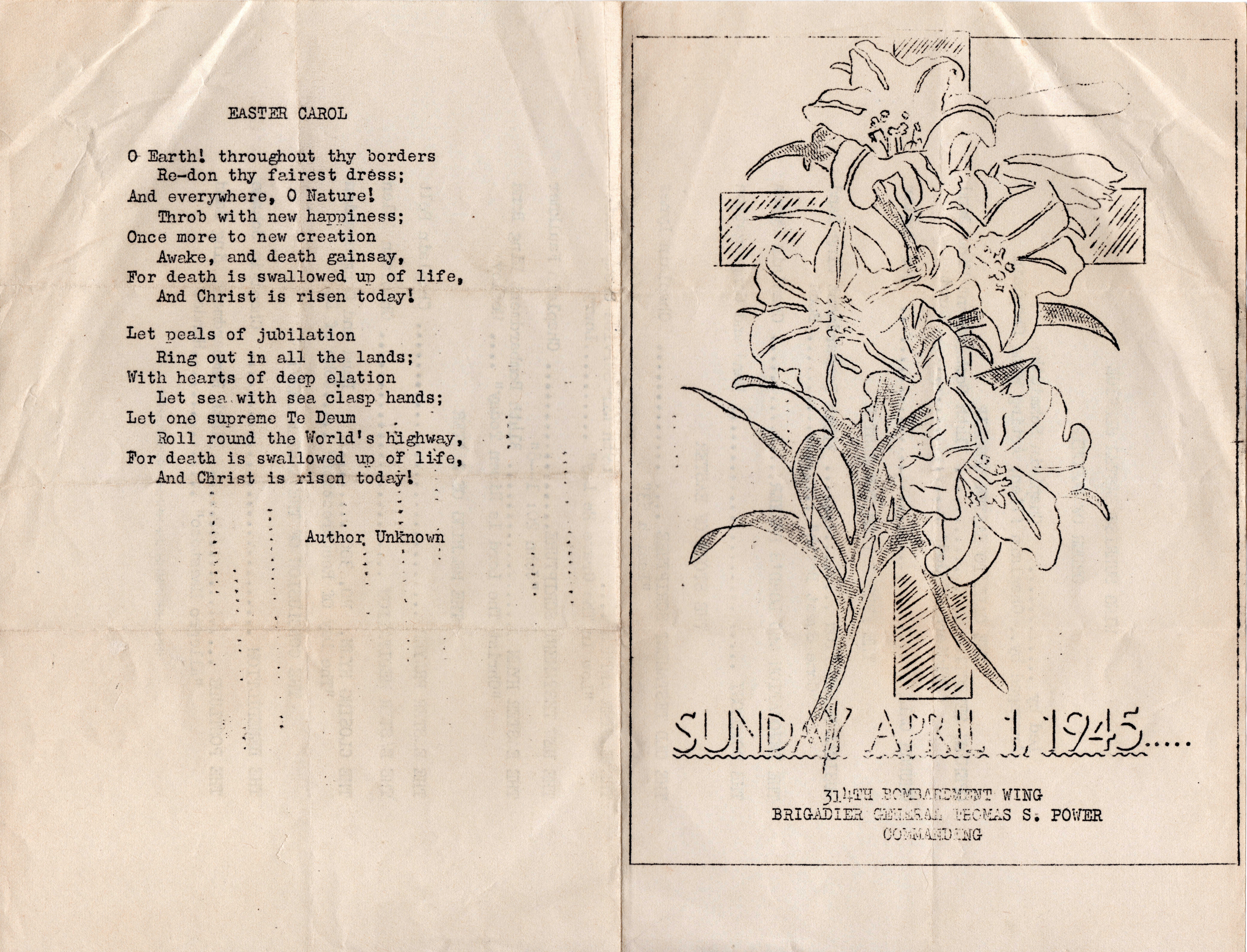 Inside of Easter Worship Service bulletin, 1 April 1945, 314th Bombardment Wing, Guam (TCK Archives).