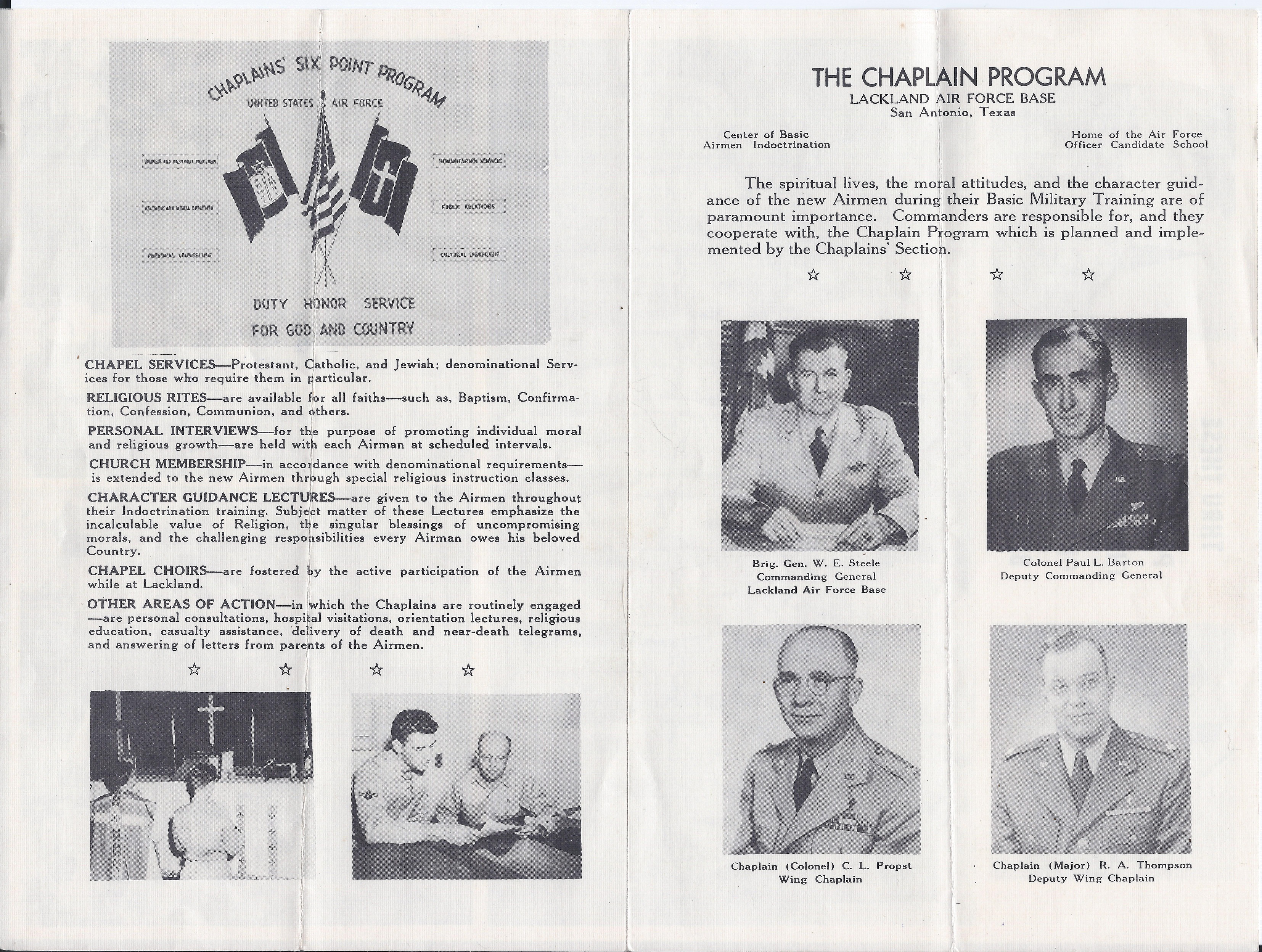 About five years after the establishment of the U.S. Air Force as a separate department of the War Department (Department of Defense by then), the Chaplains’ Department of Lackland Air Force Base, home of the Center of Basic Airmen Indoctrination and the Air Force Officer Candidate School, published a brochure which briefly describes the Chaplain Program of the base. The brochure includes some interesting pictures of religious support operations on Lackland (author’s collection).