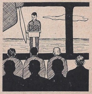 “Your Chaplain will be most happy to see you at any time. He will be able to suggest many activities which can occupy you during your off-duty hours. Opportunities for being an active churchman are many in the Armed Services. The Chaplain is to a great extent dependent upon you for his program. You will see to it that the bulletin board has an up-to-date announcement concerning the service schedule. If you can procure some lumber you might build a religious corner in your day-room and keep that supplied with good tracts, devotional booklets, and other religious literature.