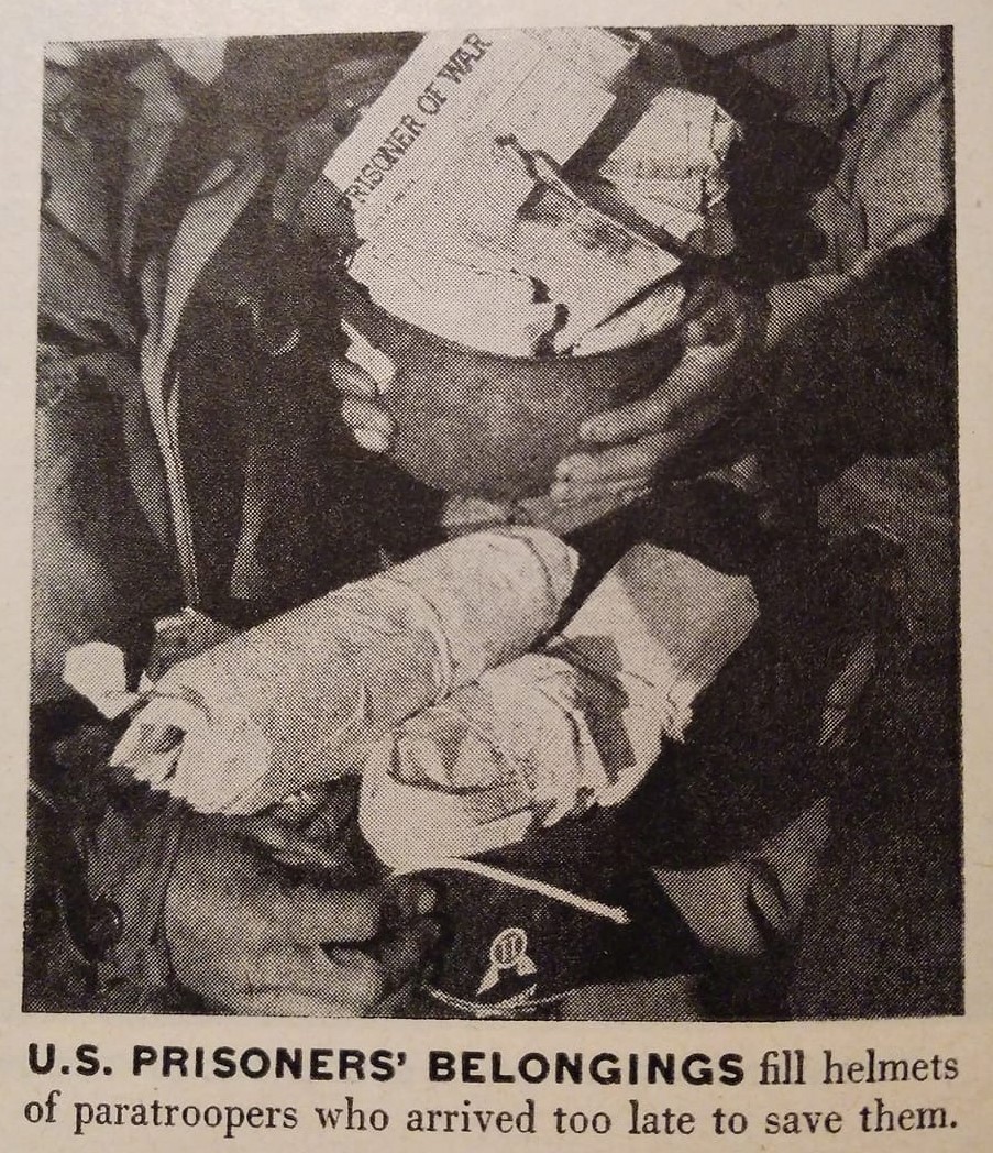“With the chaplain were two men. They carried the paper-wrapped personal effects of the 75 murdered Americans, which neatly filled two GI helmets.”