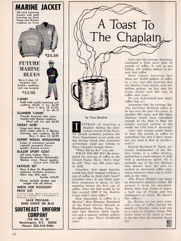 Chaplains and coffee are intimately linked, especially during deployments when they provide donated coffee for their service members. The following article from a 1971 Leatherneck Magazine reminds us of Chaplain George Jones and his introduction of coffee to the Navy in 1842, as well as the enormous amount of coffee Marines drank in 1971.