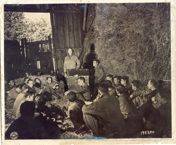 Artillerymen attached to an Armored Unit attend Protestant Services held in a barn near France.