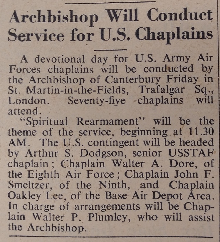 “‘Spiritual Rearmament’ will be the theme of the service, beginning at 11:30 AM. The U.S. contingent will be headed by Arthur S. Dodgson, senior USSTAF chaplain; Chaplain Walter A. Dore, of the Eighth Air Force; Chaplain John F. Smeltzer, of the Ninth, and Chaplain Oakley Lee, of the Base Air Depot Area. In charge of arrangements will be Chaplain Walter P. Plumley, who will assist the Archbishop.”