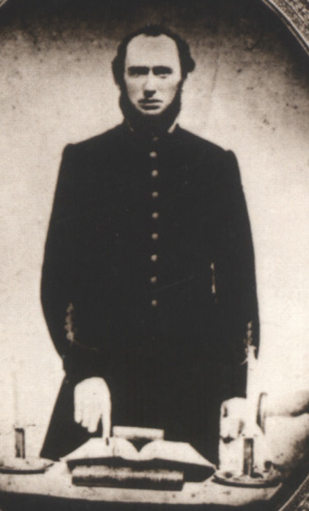 Chaplain Nicholas Davis of the 4th Texas Infantry, Hood’s Brigade was photographed wearing a very dark, presumably black, frock coat with a single row of gilt or brass buttons and a bit of non-regulation lace on the cuffs. Davis’ sartorial excess was no doubt attributable to the fact that he was a Presbyterian. This may be a studio portrait, but “altar” set-up could be similar to what a Protestant chaplain may use in the field with a Bible and two candles (photo from http://civilwartalk.com/threads/civil-war-chaplain-outfit.81491/)