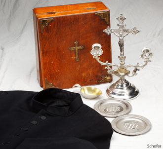 According to a Liberty University website, (Refering to the picture at right) “These communion dishes and chaplain’s robe are a few of the artifacts housed in the National Civil War Chaplains Museum on the Liberty University campus.” Pictured is the Homan Sick-Call Outift. The set that I have (identical to the one pictured at right) is marked as being patented in 1897, so couldn’t have been used during the Civil War. It’s possible, however, that similar sets could have been.