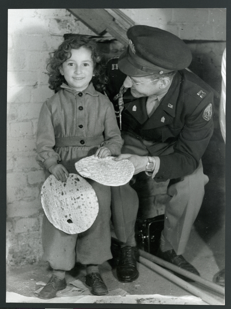 “A young Jewish girl in the JDC-supported Berlin-Mariendorf DP Camp shares matzahs with Captain J. Robbins, Jewish Chaplain for Berlin. Berlin, c 1946.” (Photo from American Jewish Joint Distribution Committee)