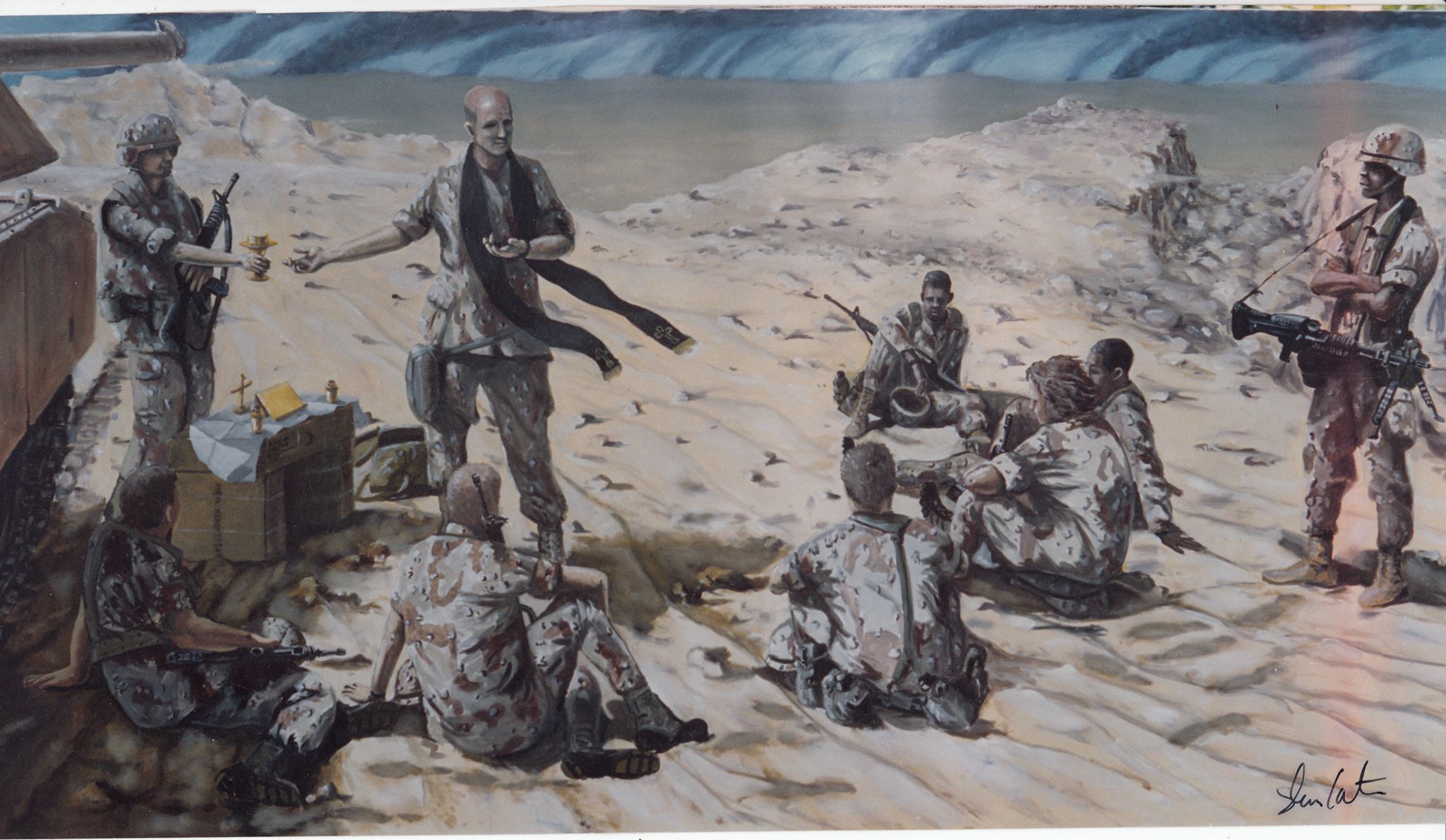 Field service conducted by Chaplain Bailey during Operation Desert Storm, painted by SGM Steve Carter (photo from the Chaplain Regimental Museum Association Facebook page).