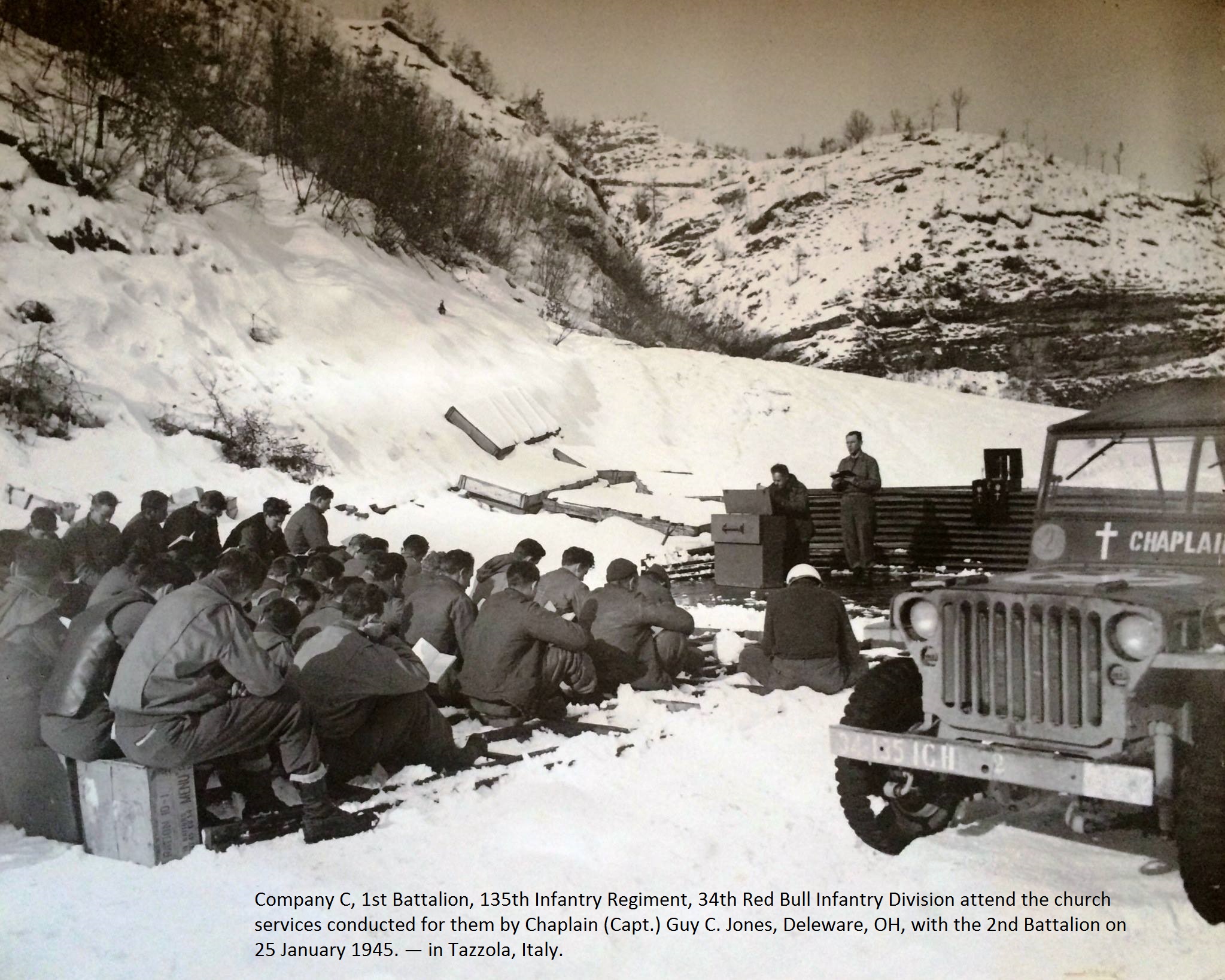 Chaplain (CPT) Guy C. Jones conducting worship service for Co C, 1st BN, 135th IN Reg, 34th IN Div 25 Jan 1945 in Tazzola, Italy.