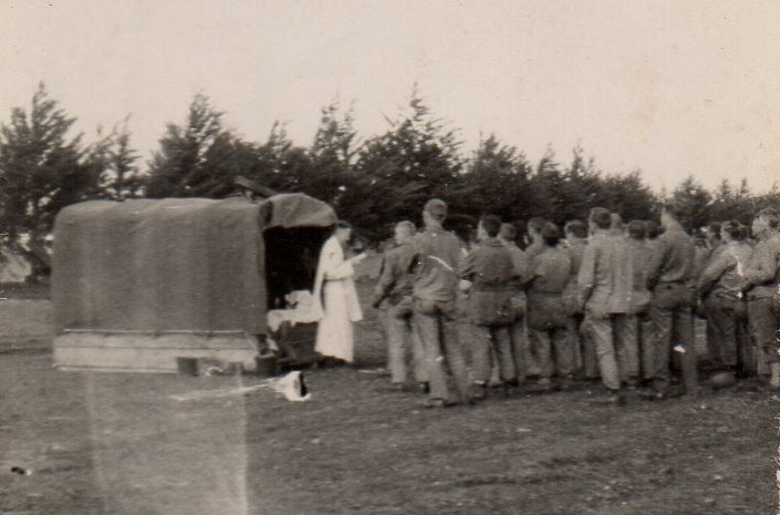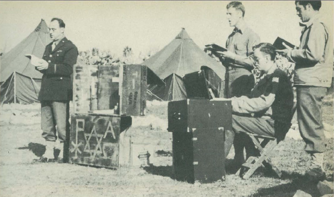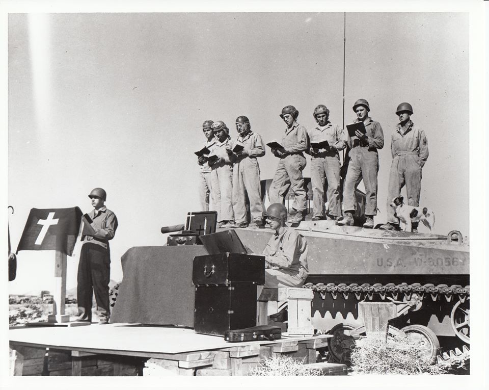 Chaplain Israel Yost leading a worship service for Soldiers in Orciano, Italy, July 1944 (U.S. Army Signal Corps photo)