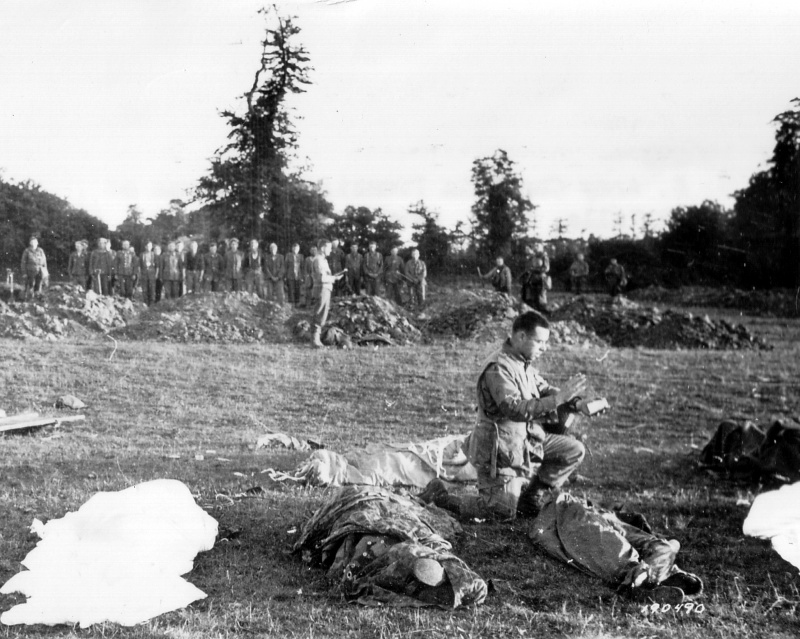 FRANCE. June/July, 1944. An American chaplain comforts a dying German soldier as prisoners of war look on.