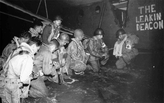 Chaplain (Major) Edward J. Waters, Catholic Chaplain from Oswego, New York, conducts Divine Services on a pier for members of the first assault troops thrown against Hitler’s forces on the continent. Weymouth, England., 06/06/1944 (U.S. National Archives).