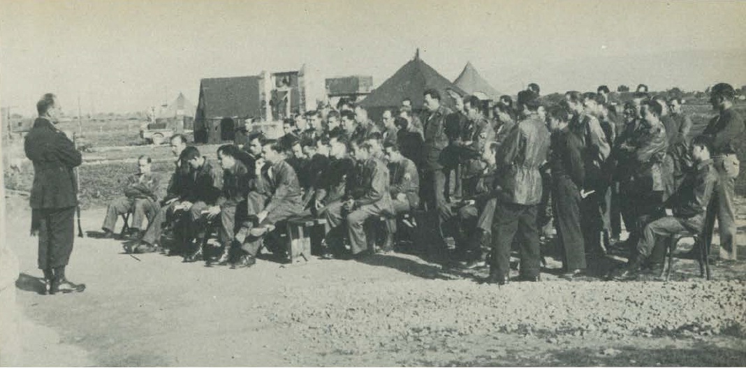 Major William F. Reiss, Chaplain, First Airborne Task Force (FABTF) leads G-2 staff in prayer before departing for Southern France; picture taken at Voltone Airfield, Italy, 15 August 1944