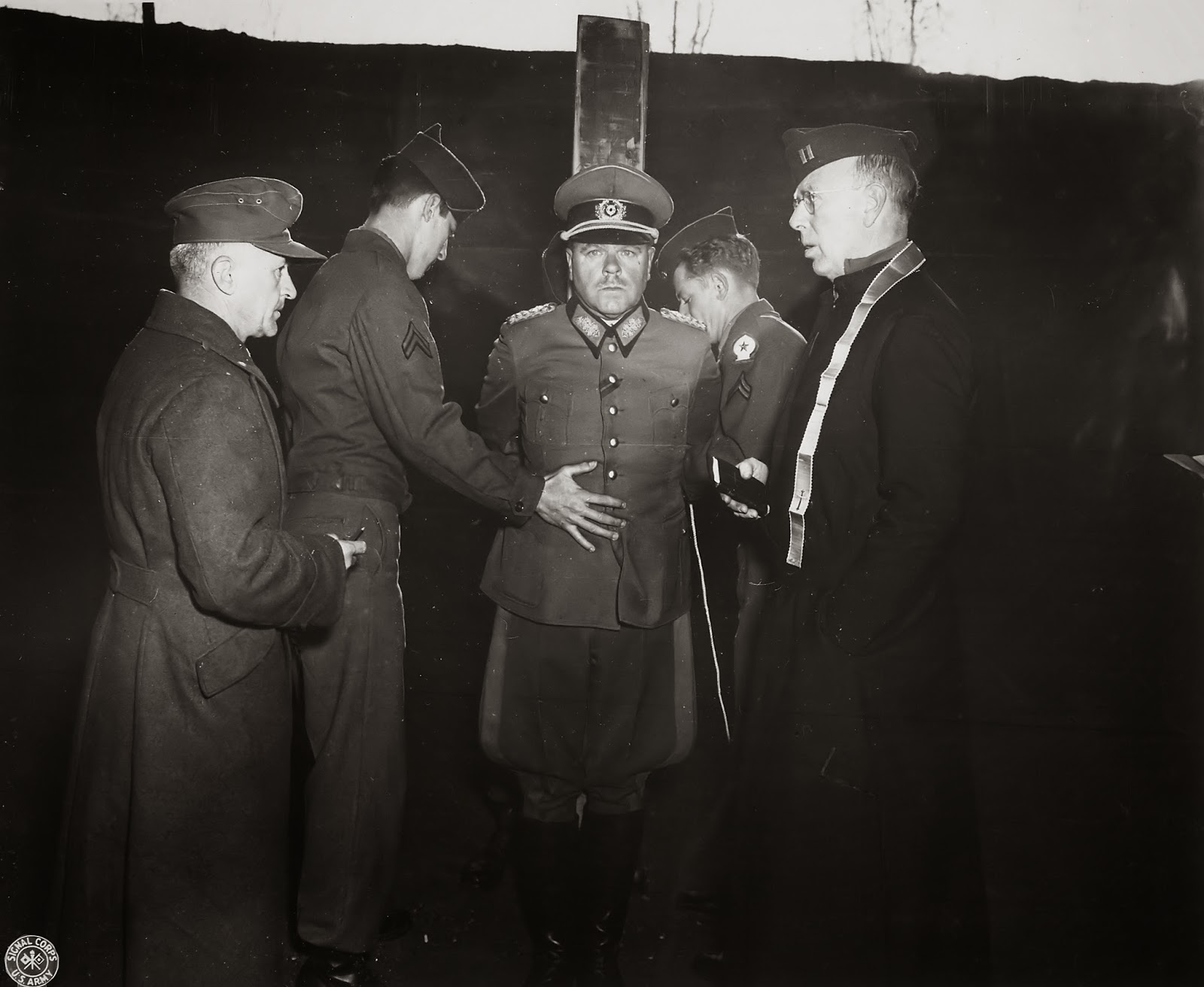 Unnamed Army chaplain with German General Anton Dostler, tied to a stake before his execution by a firing squad, Italy, 1945.