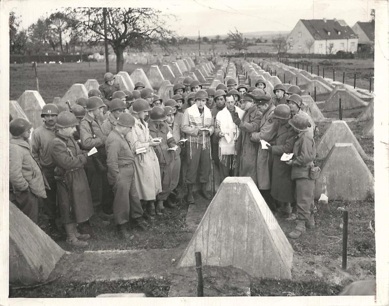 American chaplain Rabbi Herschel Schacter conducts religious services at the liberated Buchenwald concentration camp in 1945. (Photo public domain)