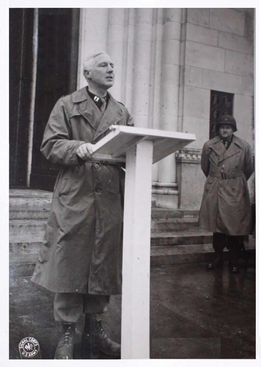 Chaplain F. McDonald of the 12th Army Special Troops, leads a Thanksgiving prayer for the leaders of the 12th Army in 1944.