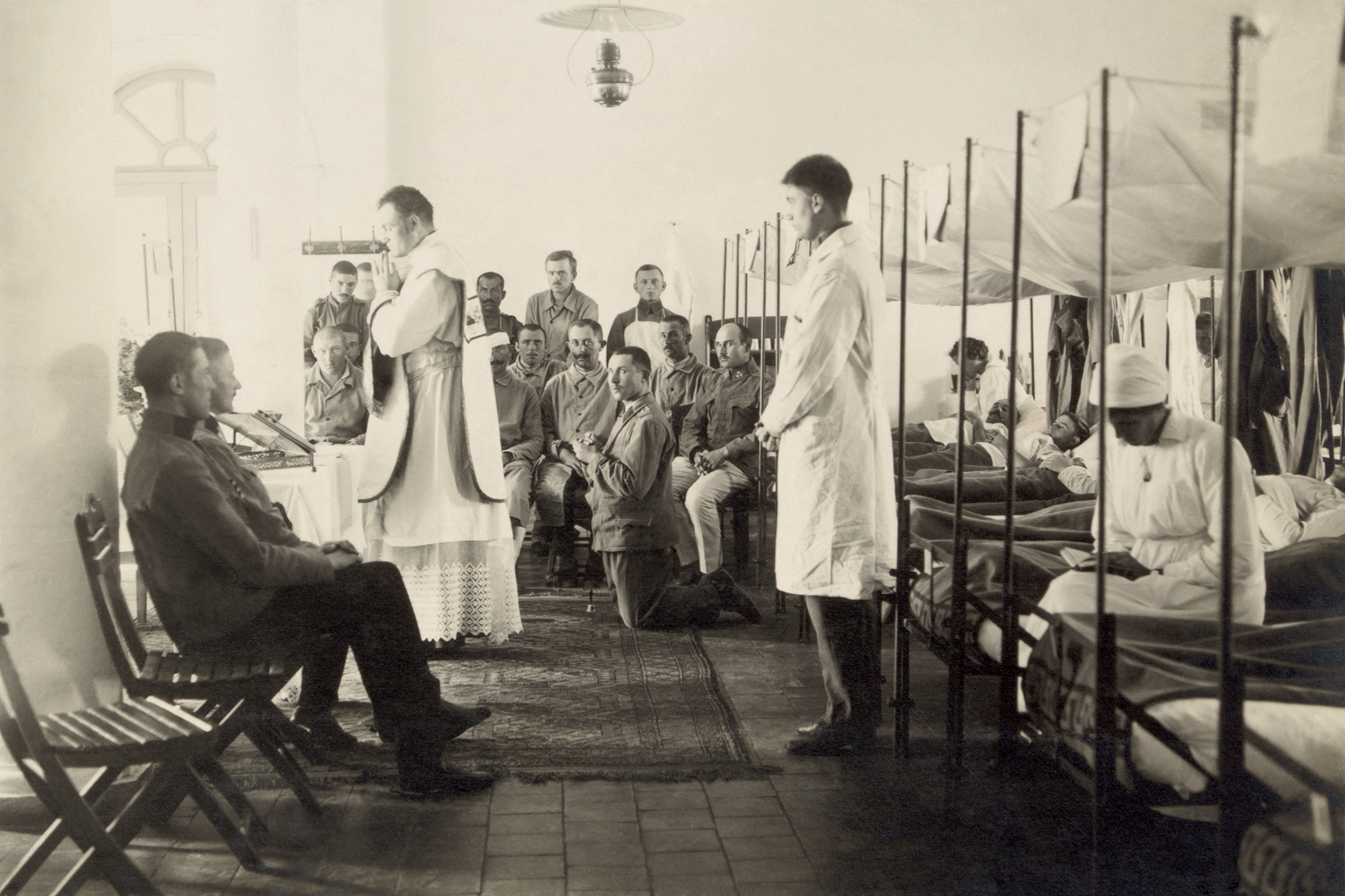 “A Scene repeated often with minor variations in many lands as the armies marched forth in 1914: The Blessing of the Swords: An Austrian Army Chaplain giving his benediction to young soldiers at the Military Academy in Vienna” (From “Mid-Week Pictorial” Published weekly by the New York Times Company, week ending July 28, 1934).