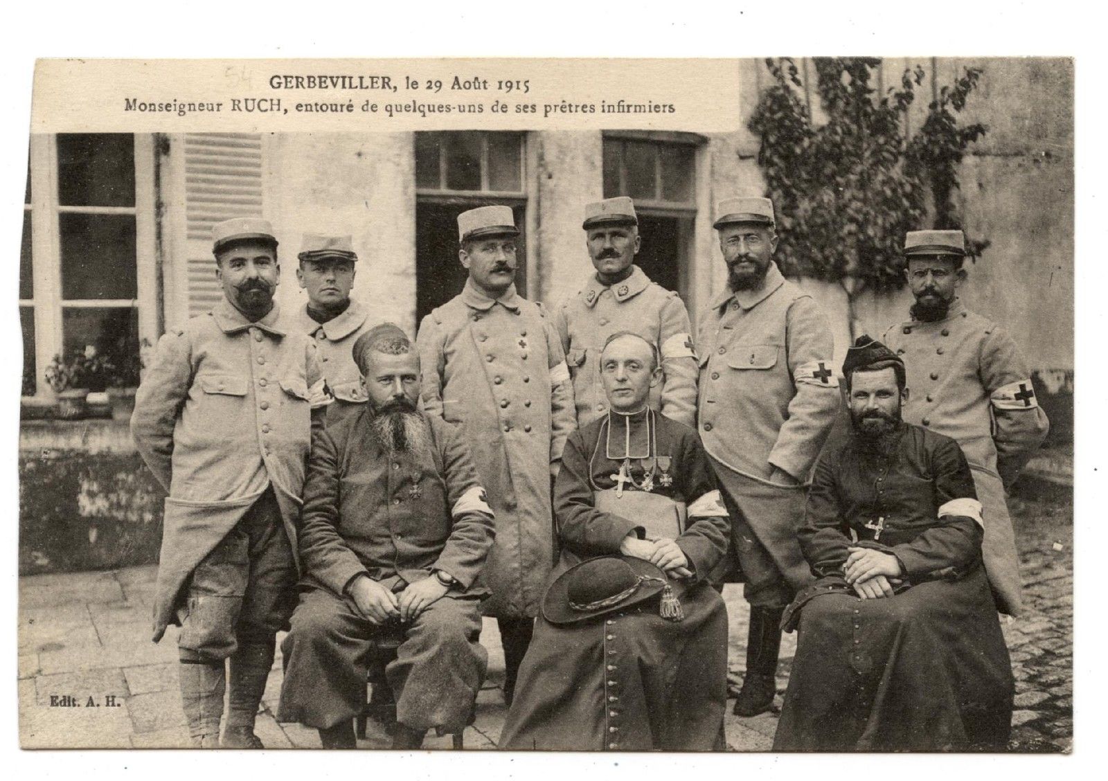 “Gerbeviller [France], 29 August 1915. Monseigneur Ruch, surrounded by some of his priests [chaplains] and nurses.”