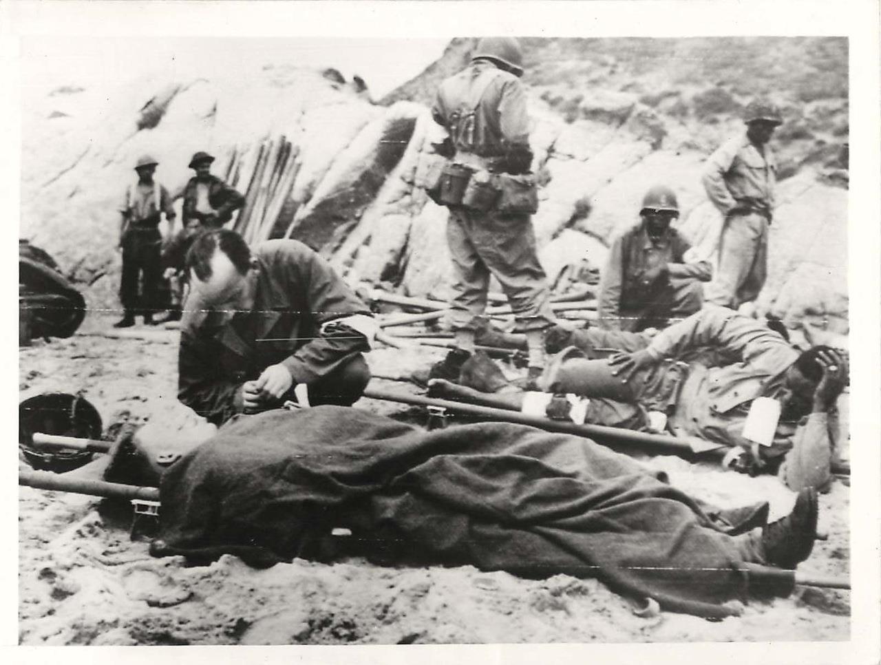 From back: “THE PRICE OF BATTLE…A French chaplain administers the Last Rites to a wounded French soldier on the beach at Elba, during the conquest of the famous island. French soldiers were among the first to feel the effects of war. At first defeated, they were reorganized, then thrown back into battle as an important unit of the Mediterranean forces. Now they again feel war’s sting and pay the price of battle. 6/20/44 (Signal Corps Radio-Telephoto from Algiers via Acme).”