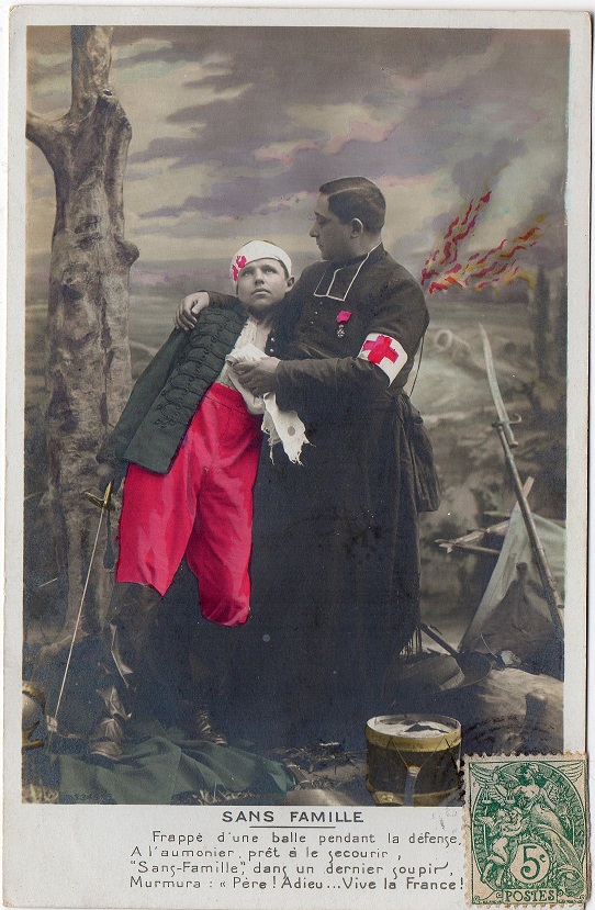 Just before WW1, caption reads: “Strike of a ball during defense, The chaplain, ready to help, ‘Without family,’ in a last sigh, ‘Good-bye Father…Long live France!'” (TCK archives).