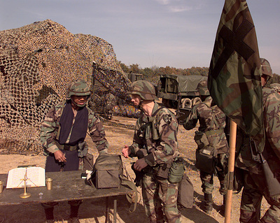 U.S. Army Chaplain Maj. Rodney Lindsay (left) talks to a soldier after performing a Protestant worship service at the Twin Bridges operations area near Camp Casey, Republic of Korea, on Oct. 29, 1998, during Exercise Foal Eagle ’98. Foal Eagle ’98 is a combined, joint exercise supported by forces from the U.S. and Republic of Korea. In addition to providing hands-on field experience for forces of both nations, Foal Eagle ’98 was designed to test rear area protection operations and major command, control and communications systems. Lindsay is assigned to the 1st Brigade, 2nd Infantry Division, Camp Casey (photo origin unknown).