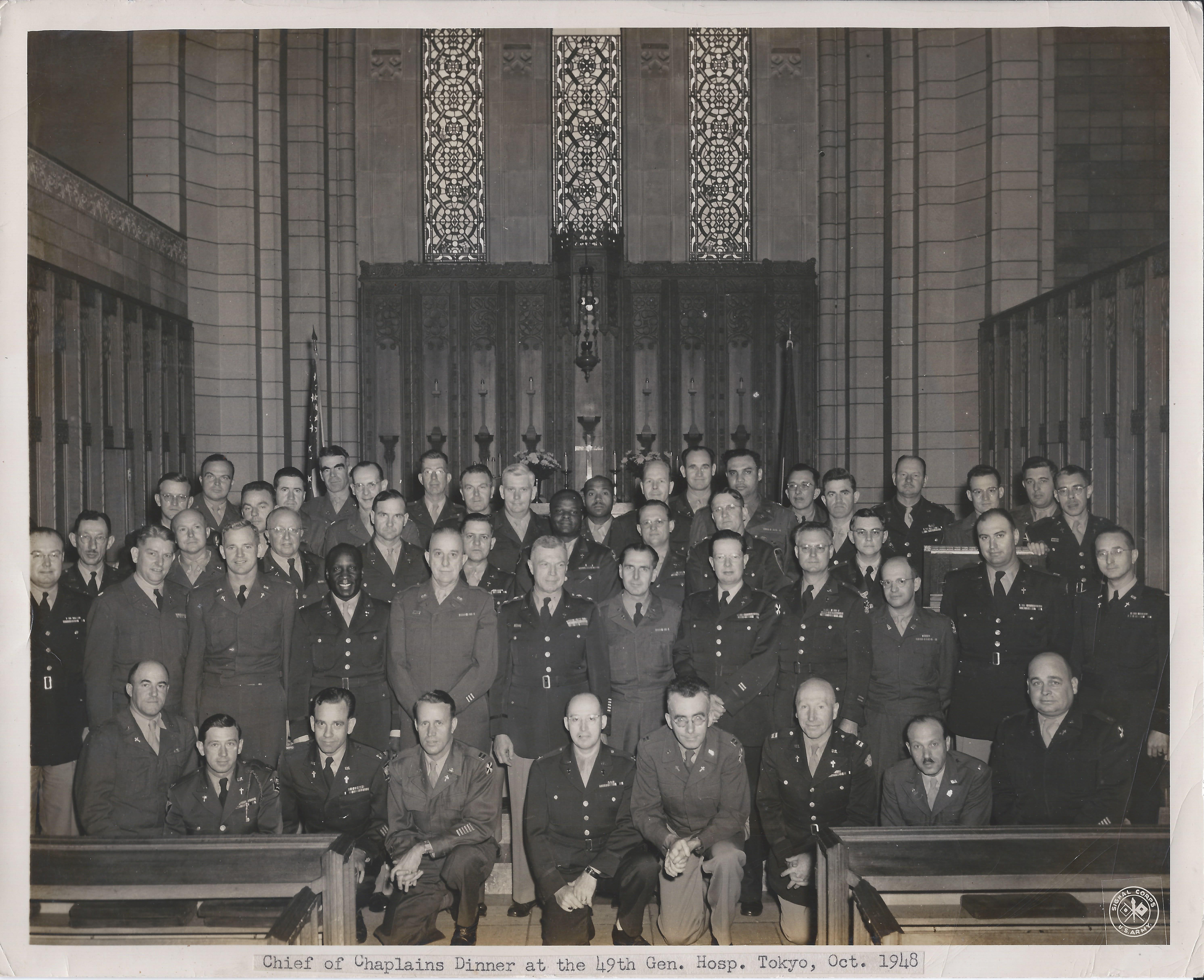 “20 OCT 48, CHAPLAINS ASSOCIATION MEETING: Pictured inside St. Luke’s Chapel, Tokyo, Japan, are members of the Army and Navy Chaplains Association. Chap. (Maj. Gen.) L.D. Miller (center, standing) addressed the chaplains present and commended all for the work accomplished in the FFC. Photographer-Orzio, Photograph by U.S. Army Signal Corps.,” (author’s collection).