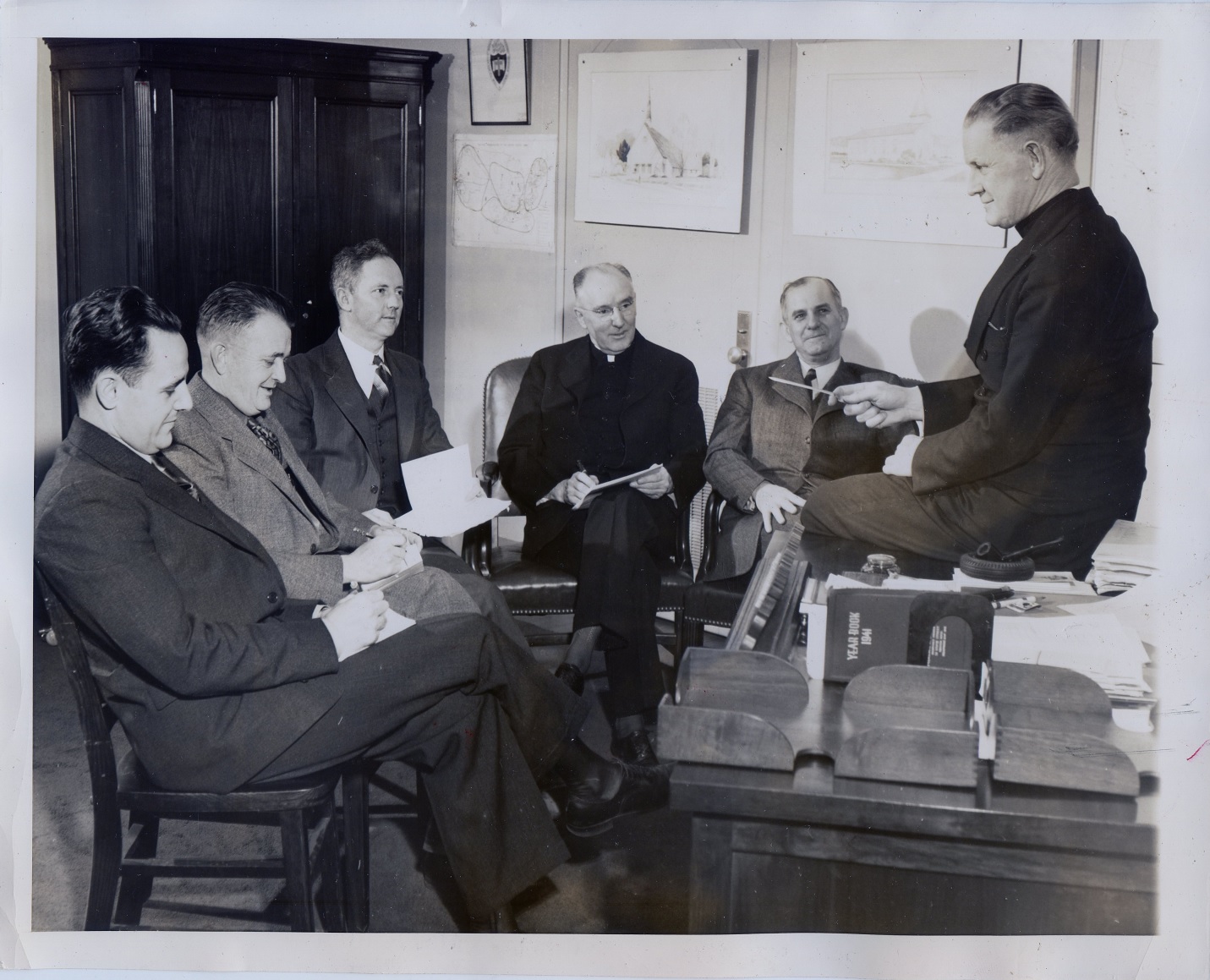 “COL. William R. Arnold, Chief of Army Chaplains, gestures to emphasize a point at a meeting with division heads of his office staff…On the wall are architect’s drawings of recently approved, proposed Army Post Chapels” 5/3/41 (author’s collection).
