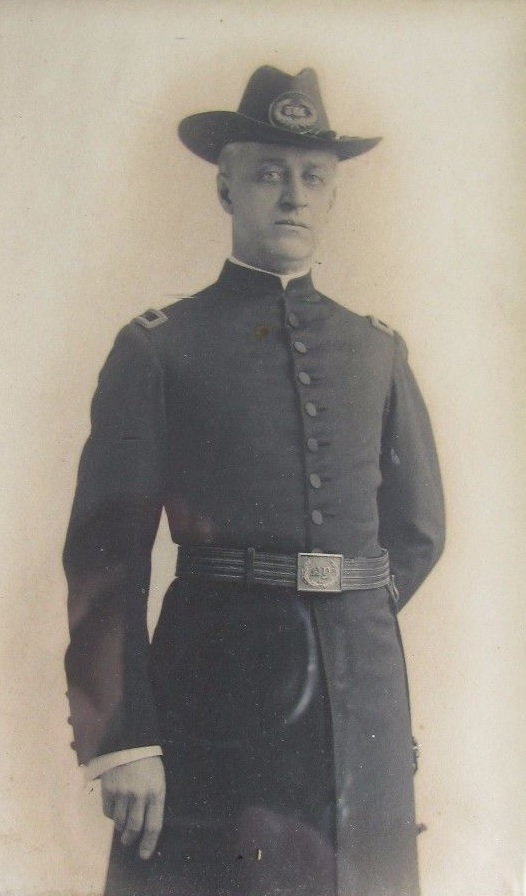 “General Order No. 169 of 1907 gave chaplains a black frock coat as their full dress uniform, but they were to wear the same dress, service, and white coats as other officers…A black hat was prescribed with the dress and full dress uniforms, but chaplains wore the same caps or hats as other officers with the white and service coats” Honeywell, pg. 157)