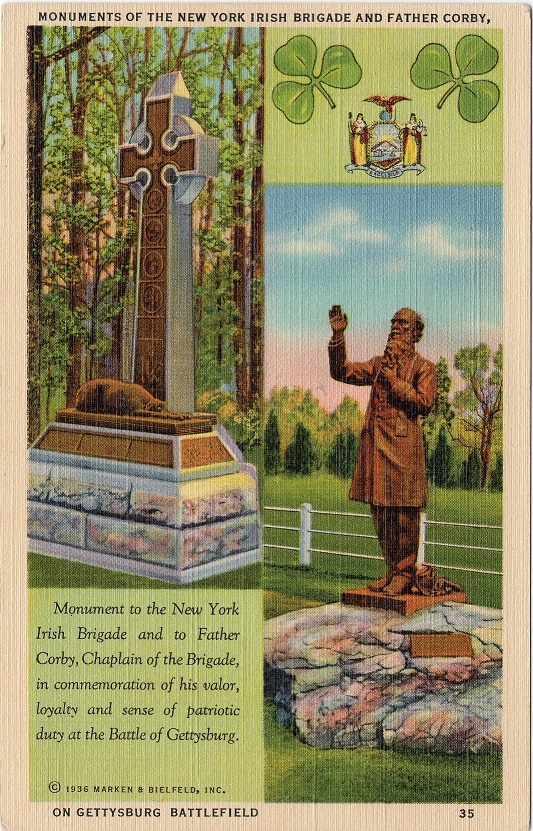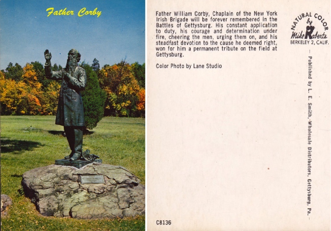 From the back: “These monuments erected on the Gettysburg Battlefield portray one of the most human interest stories of this famous battle. The Irish Brigade composed principally of New Yorkers were ordered into the battle. Father Corby asked permission to talk to the men for a few minutes. It was granted and he delivered a momentous talk before pronouncing an absolution for all his men. Immediately thereafter they were commanded to go into the fight and displayed remarkable service and fortitude” (TCK archives).