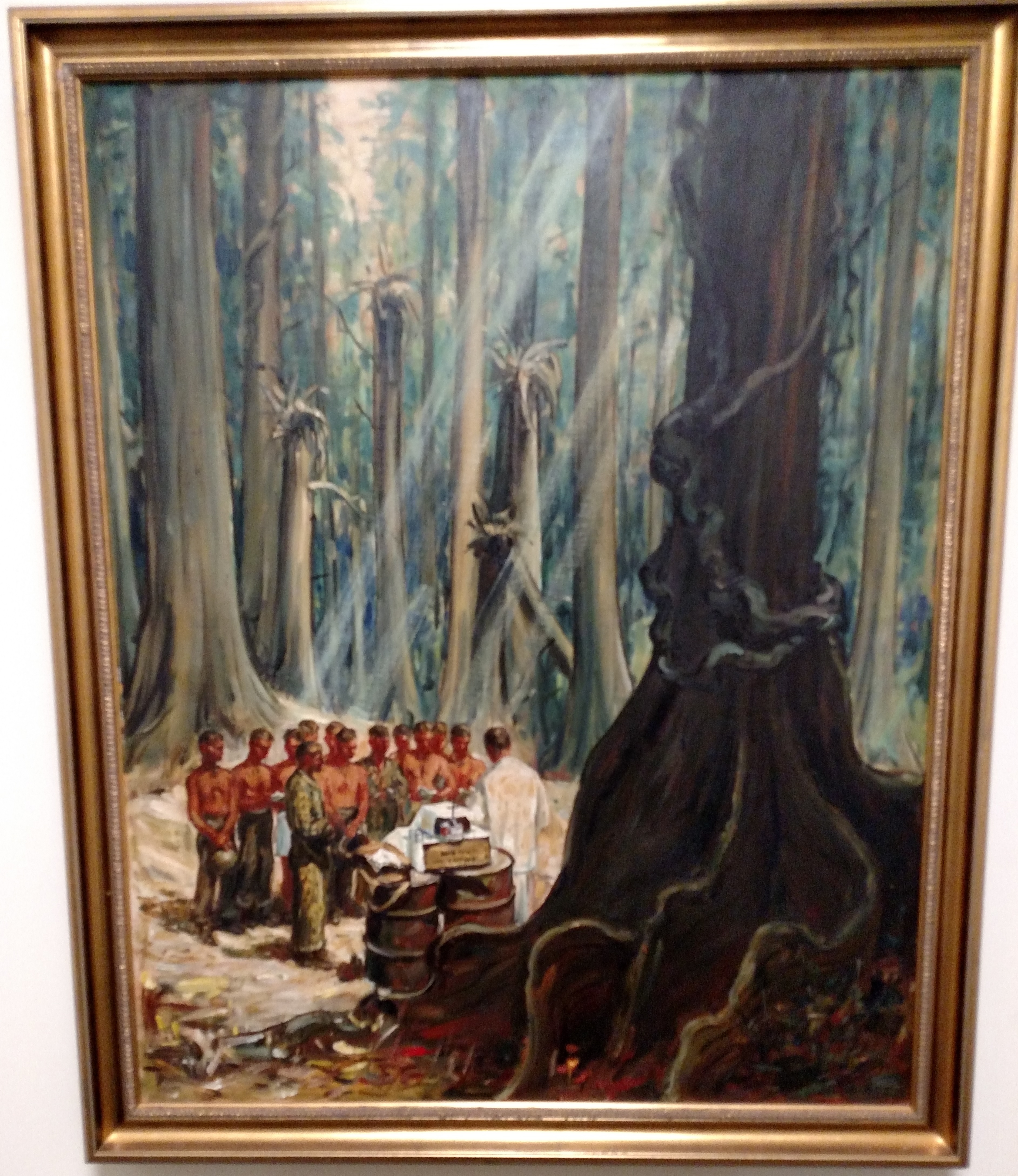 Hanging in one of the halls of the Naval Chaplaincy School is this church pennant with a plaque that reads: “This church pennant flew over Naval Air Station Quonset Point, Rhode Island, October 1941 for first Divine Service. Donated by Chaplain John D. Zimmermann.”