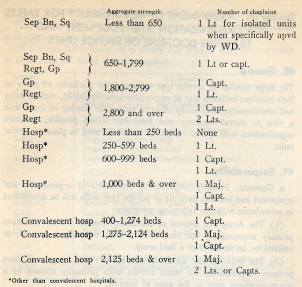 In War Department Training Manual TM 20-410, “Development and Preparation of Organizational and Equipment Authorization Tables,” April 1947, the following guidelines are given in regards to chaplains: