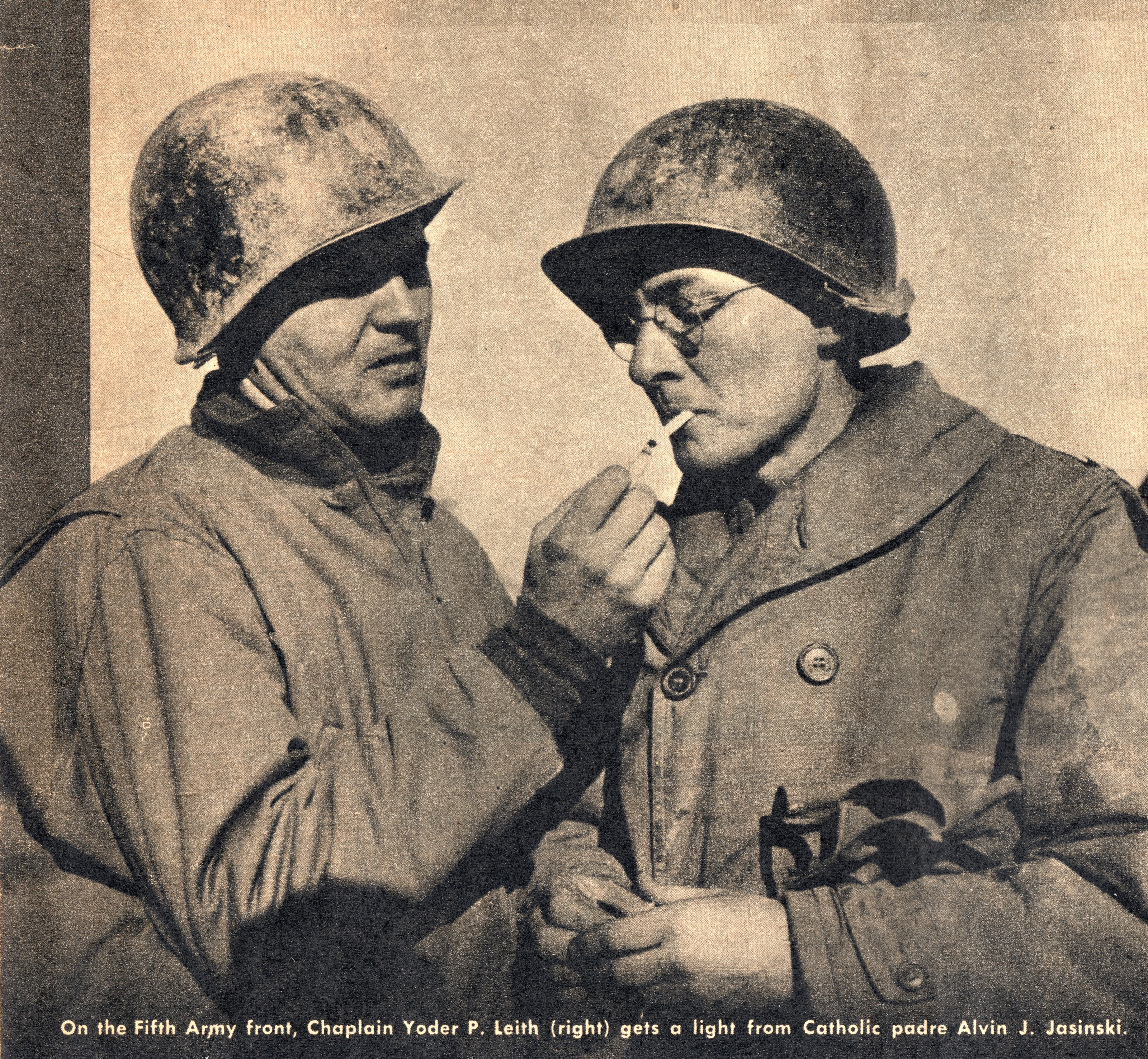 “On the Fifth Army front, Chaplain Yoder P. Leith (right) gets a light from Catholic padre Alvin J. Jasinski” from Yank magazine, 13 April 1945 (author’s collection).