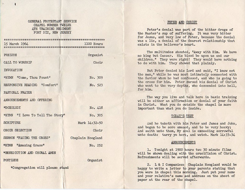 Cover of bulletin from Chapel Twelve, Fourth Army Training Center, Fort Dix, 15 March 1964 (TCK archives).