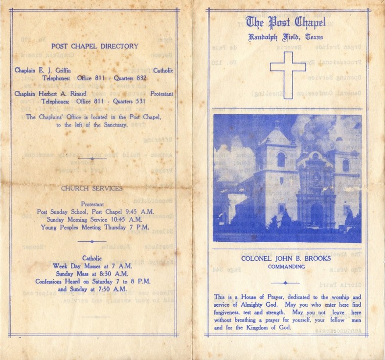 Outside of bulletin for the Protestant worship service at the Post Chapel at Randolph Field, Chaplain Herbert A. Rinard, 8th Sunday after Trinity, between 1937 and 1940 (author’s collection).