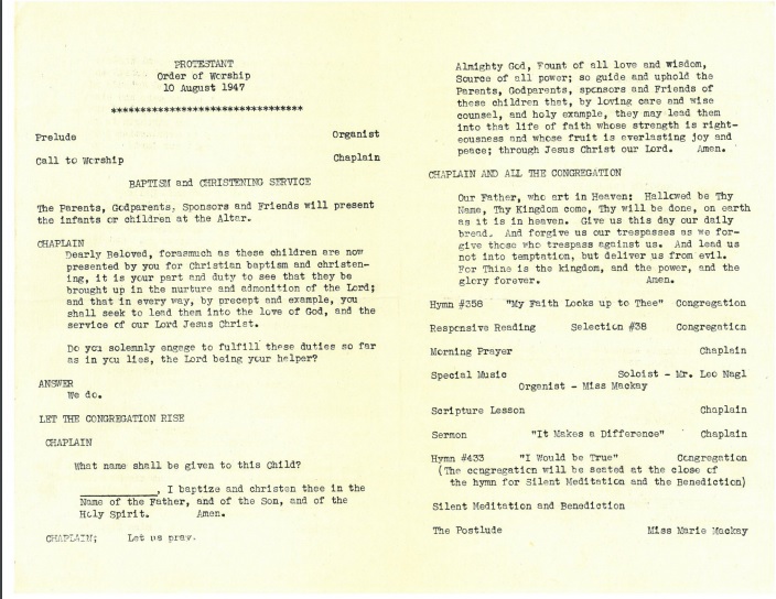 Inside of Worship Bulletin from the Post Chapel at Fort Hamilton, New York dated 10 August 1947. Found in a Bible belonging to Patricia Frasier, (courtesy of Chaplain (MAJ) Tracy Hudgins).
