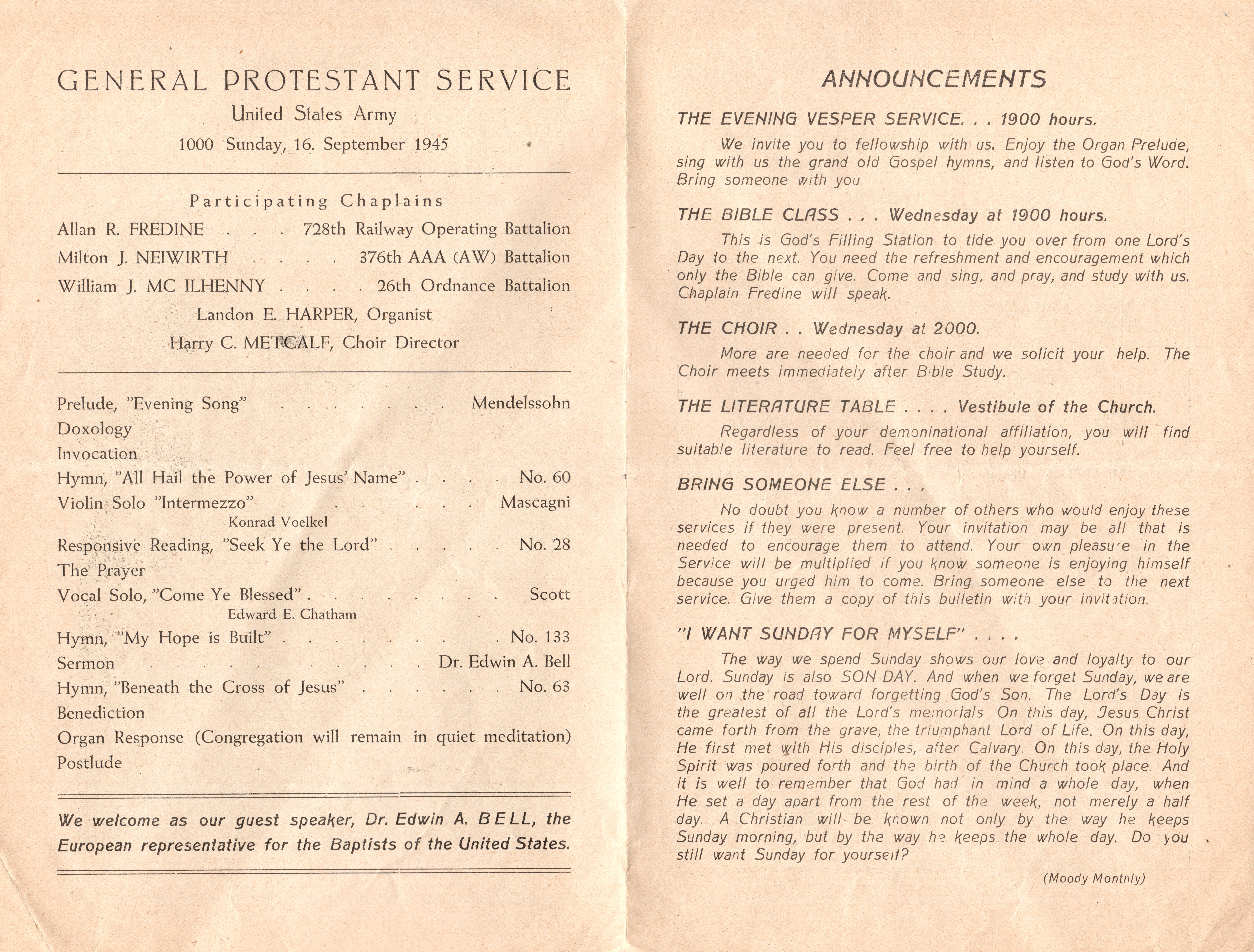 United States Army Protestant Worship Service Bulletin, St. Paul’s Evangelical Lutheran Church, Furth, Germany, 16 September 1945 (author’s collection).