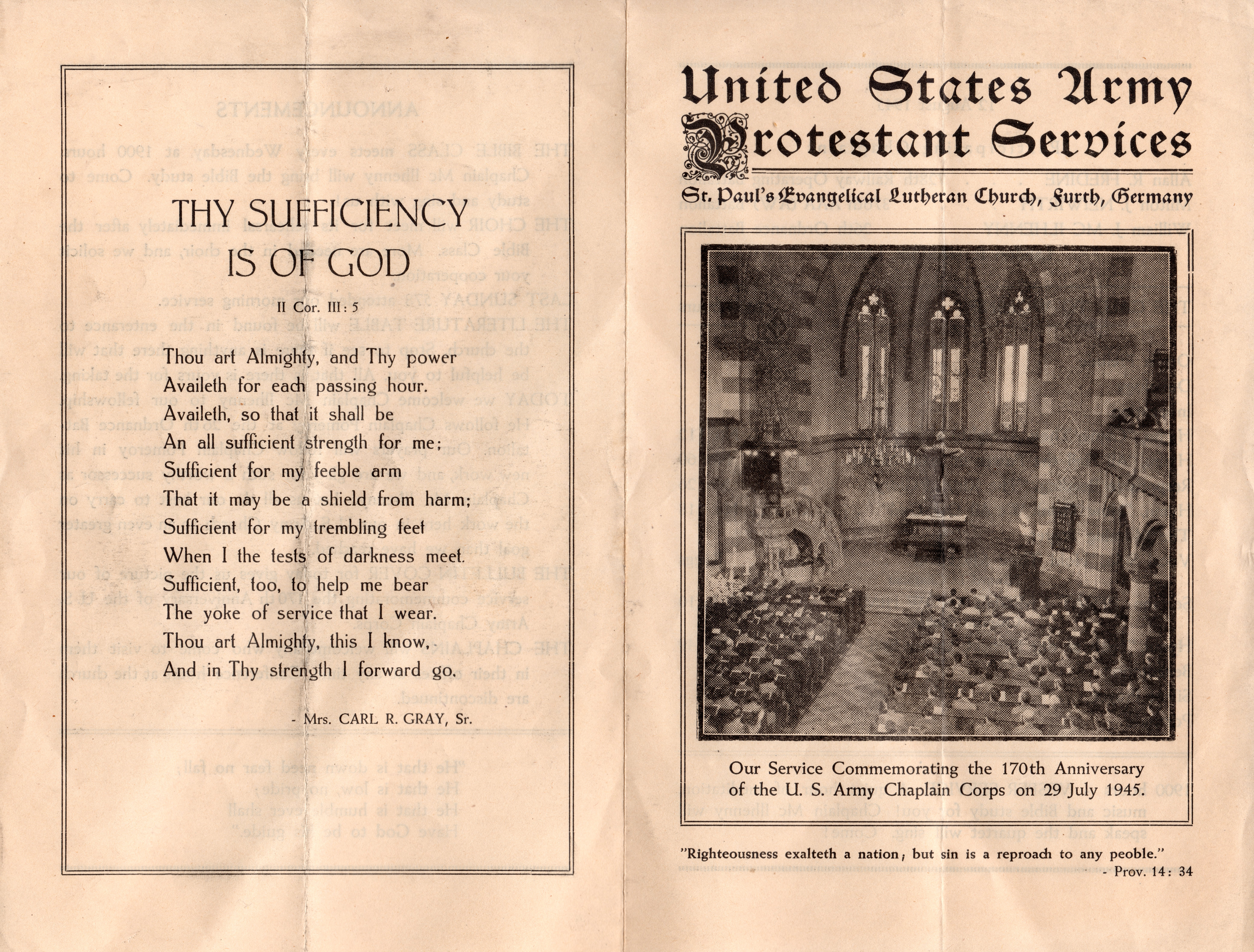 United States Army Protestant Worship Service Bulletin, St. Paul’s Evangelical Lutheran Church, Furth, Germany, 12 August 1945 (author’s collection).