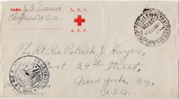 A postal cover sent from a U.S. chaplain in France in December 1918 to then Archbishop of New York, the Right Reverend Patrick J. Hayes (author’s collection).