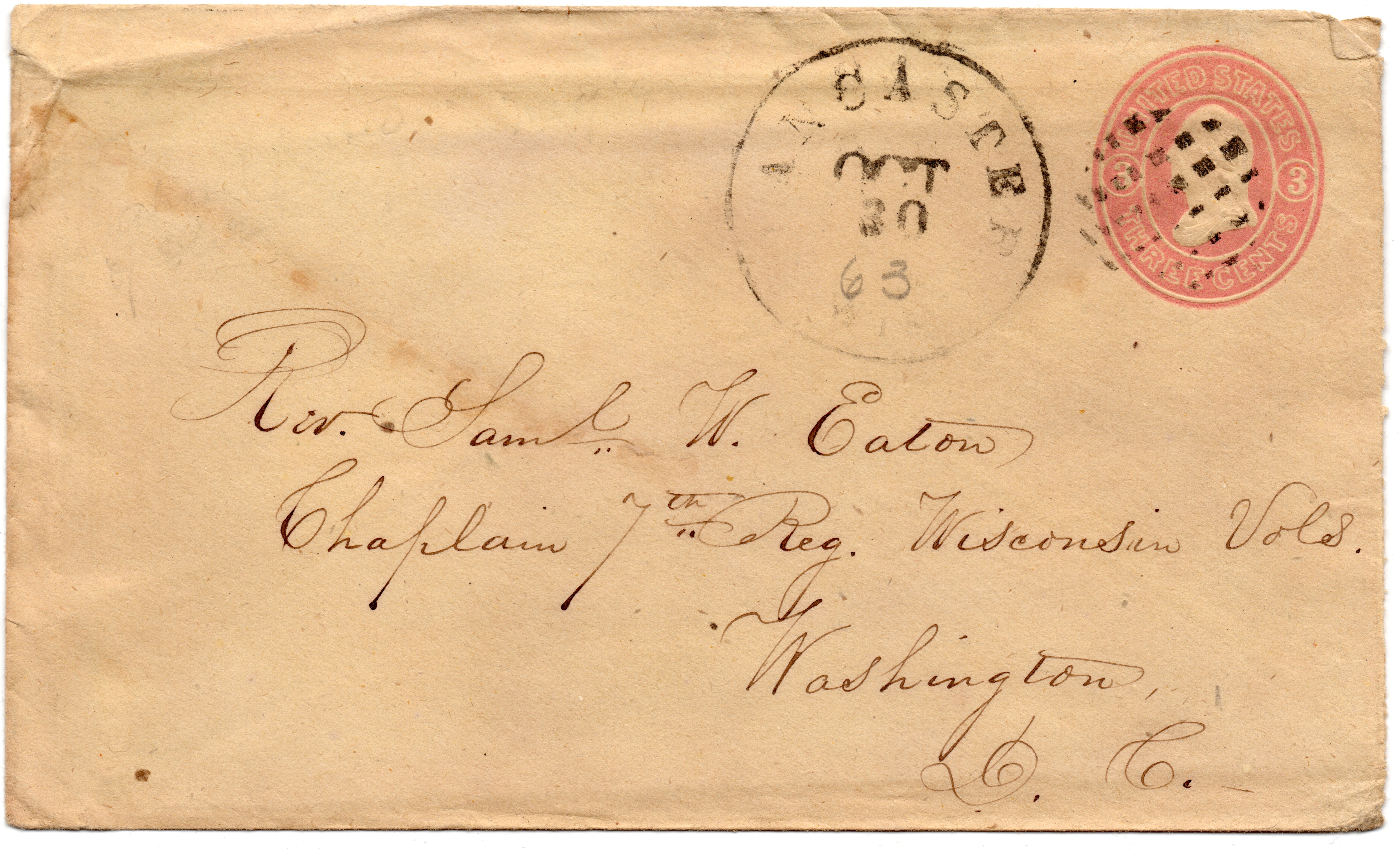 Postal cover addressed to Chaplain Samuel W. Eaton, 7th Regiment, Wisconsin Volunteers. Mailed 30 October 1863 from Lancaster, Wisconsin. The original “1863” of the postmark isn’t visible but the postage rate dates it between July-October 1863 (author’s collection).