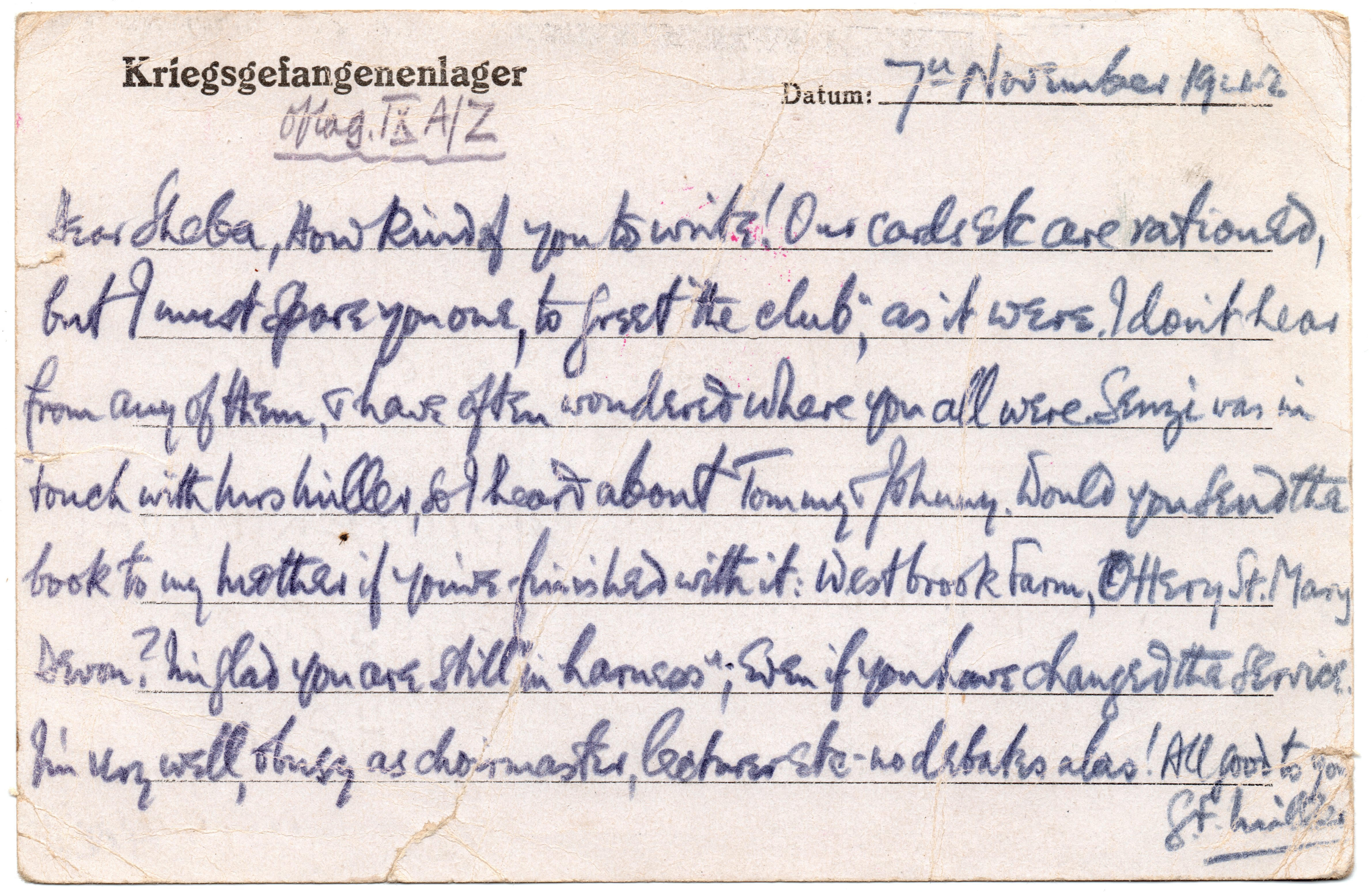Reverse side of a postcard sent from a British chaplain in a German POW Camp to a friend in England, dated 7 November 1942 (author’s collection).