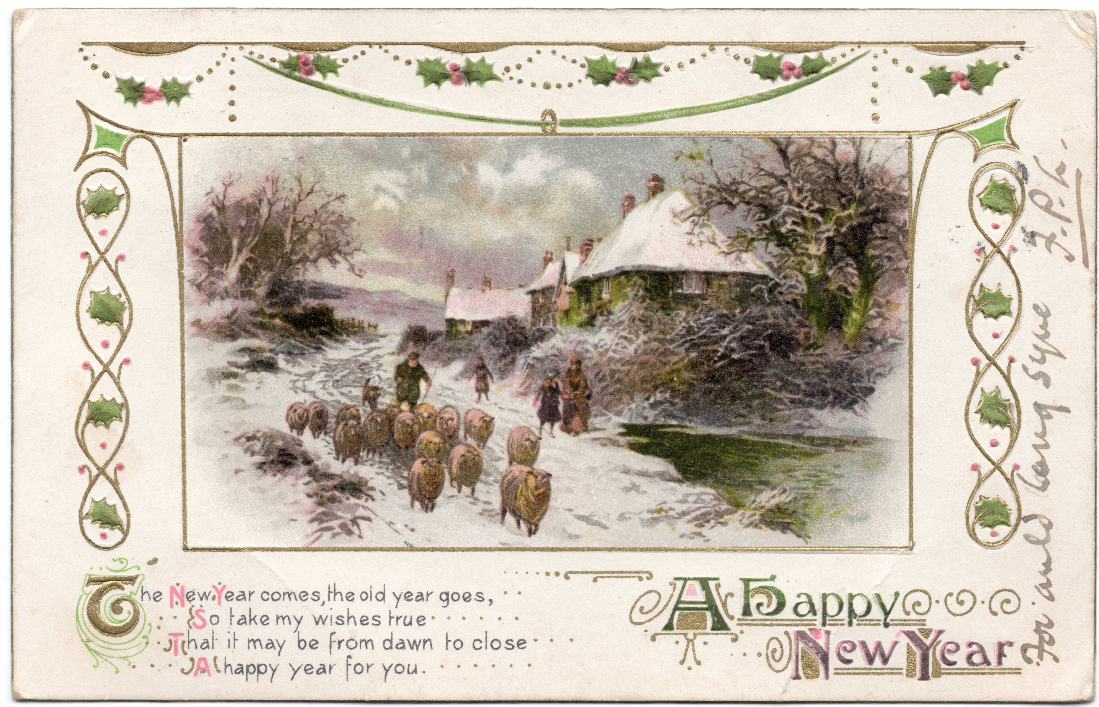 Reverse of New Year’s postcard mailed to then Chaplain of the Fleet, Hugh Wood, dated 1 Jan 1913, showing personal note, “For auld lang syne -FPL” (author’s collection).