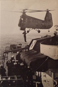 “Message from above–A Navy Chaplain is lowered from helo to fantail of DD to conduct services.” (DoD photo)