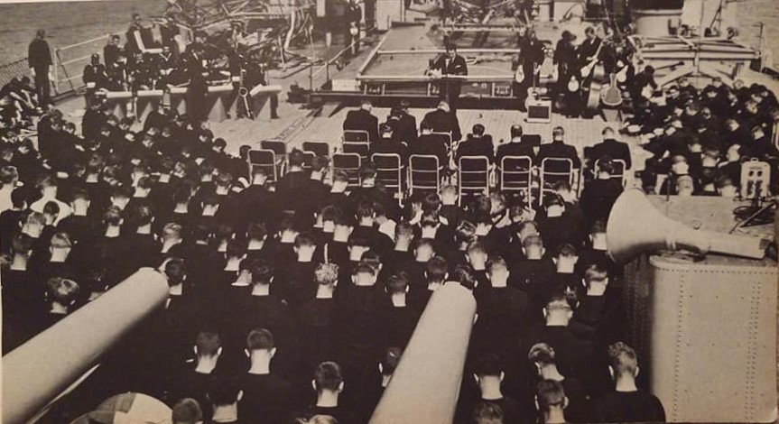 “Sea Service–Cruisermen are assembled on their ship’s fantail for religious service conducted by Navy Chaplain.” (DoD photo)