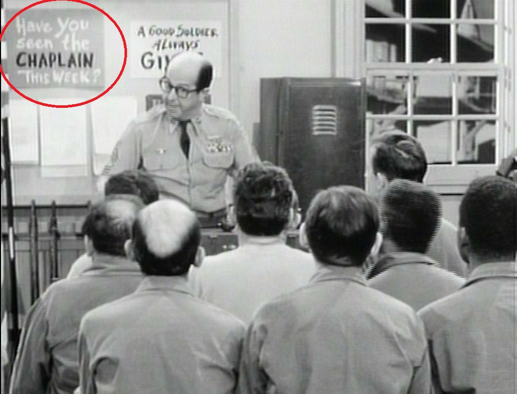 “Mink Incorporated” (Season 2) (00:00:00) At a meeting of the platoon, there is visible behind M/SGT Bilko a sign that reads: “Have you seen the Chaplain this week?”