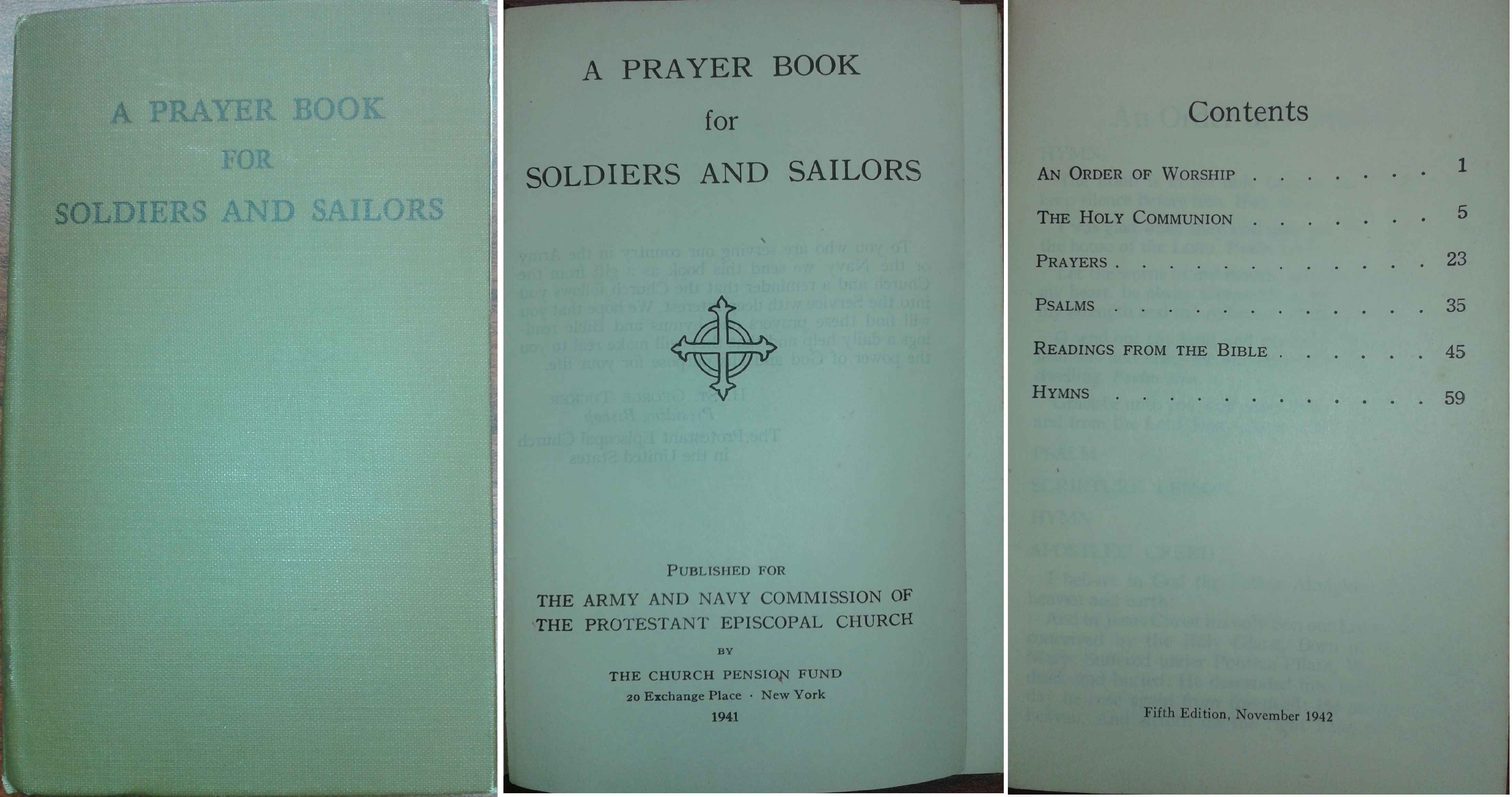 A Prayer Book for Soldiers and Sailors. Published for The Army and Navy Commission of The Protestant Episcopal Church by The Church Pension Fund, 1941, 5th ed., 1942 (author’s collection).