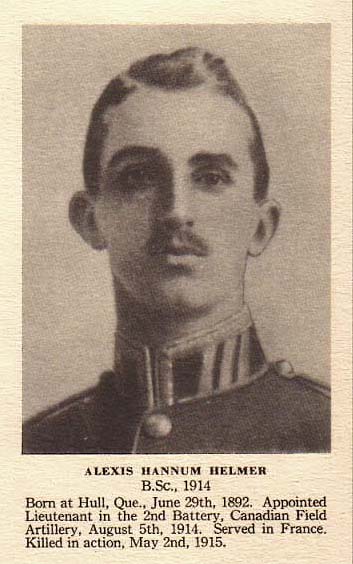 Photo of newspaper picture of Alexi Hannum Helmer, from the “McGill Honour Roll, 1914-1918”. McGill University, Montreal, Quebec, 1926, found at the Canadian Virtual War Memorial, a website of the Veterans Affairs Canada, accessed 29 May 2017
